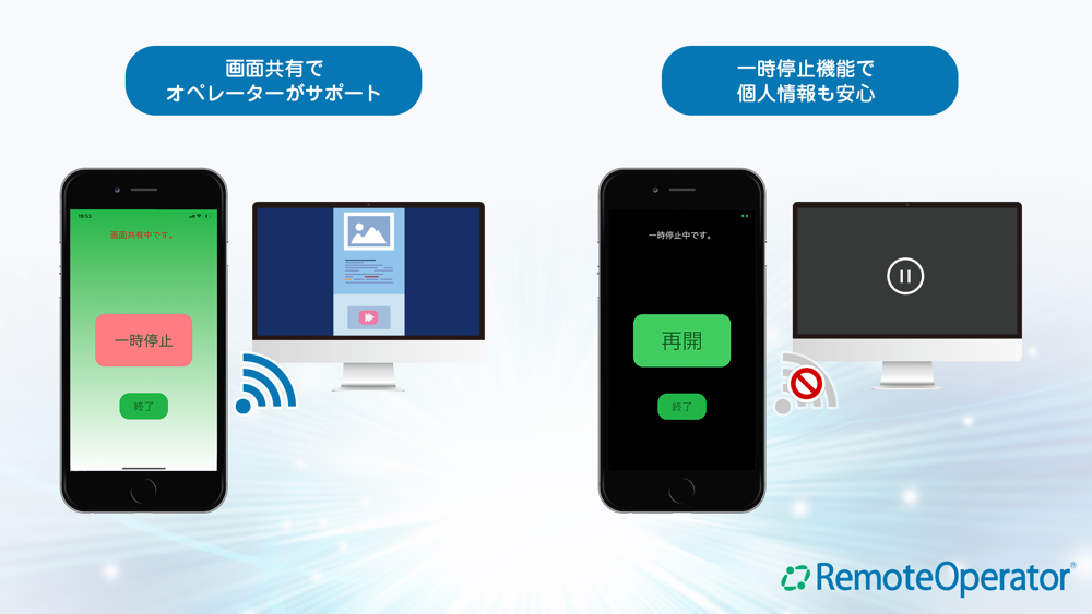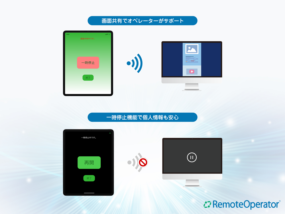 RemoteOperator Agent 2は、ご利用のiPhone、iPadの画面をオペレータに共有することで問題解決をサポートするツールです。簡単な操作で画面共有を開始できます。