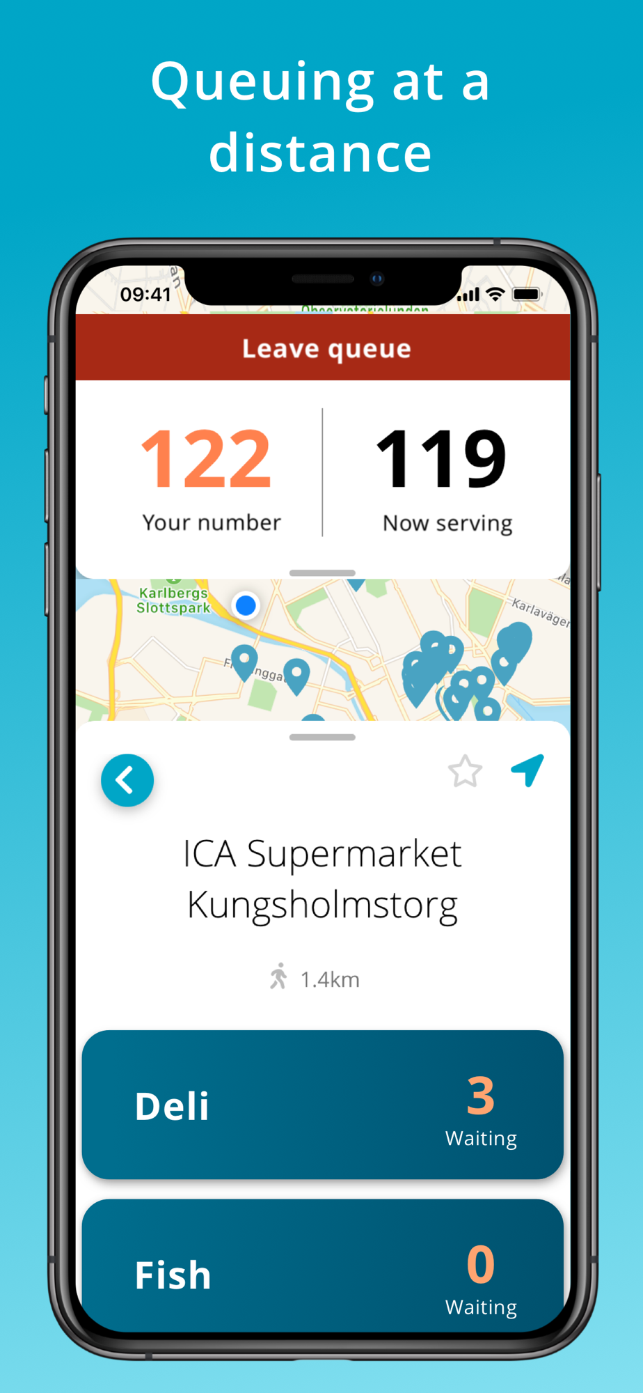 Click on a marker to see more information about that particular store like opening hours and estimated waiting time.