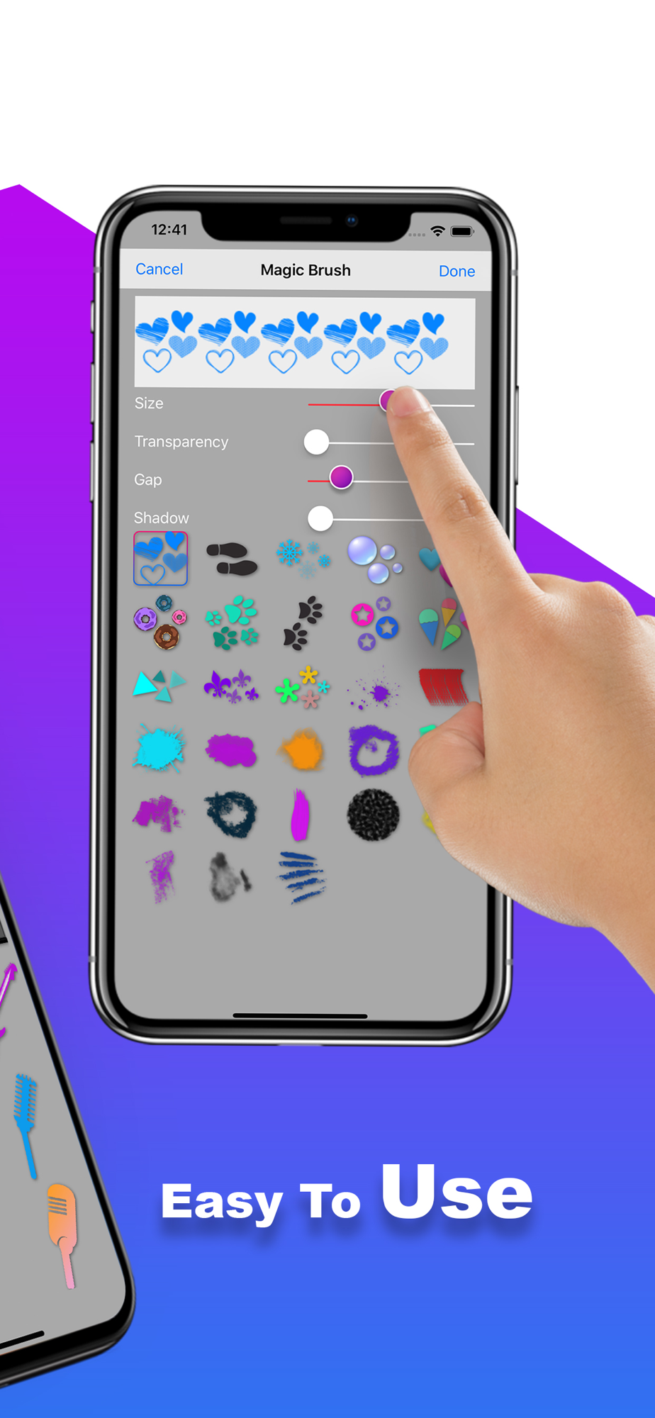 - A unique brush option to put that magical touch on your creation. Handpicked and designed to perfection to give smooth and beautiful look. Just choose the right brush image and select the size, gap between each image and shadow size. Then slide your finger to get the desired print