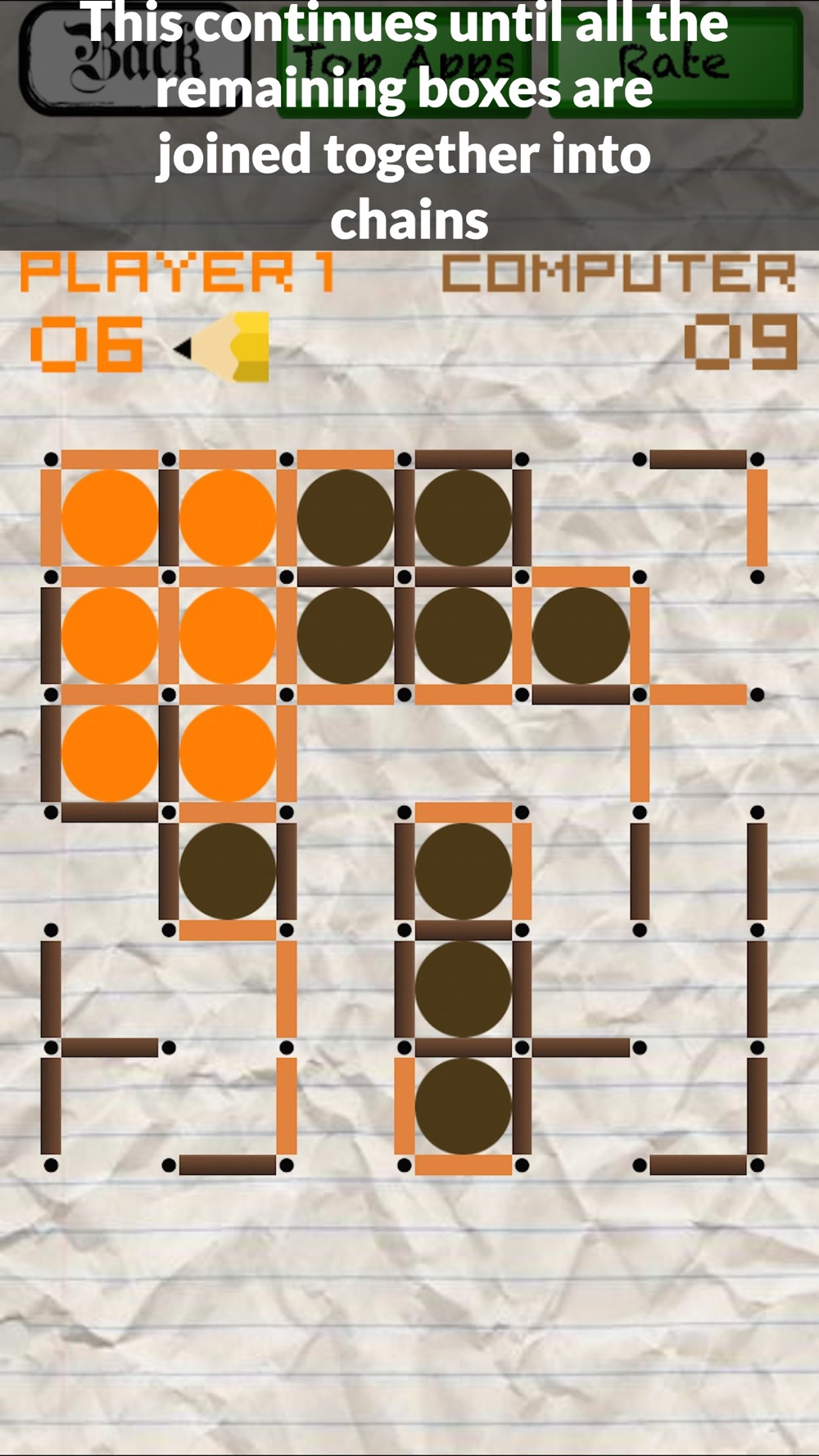 Chained Dots (also known as Boxes, Squares, Paddocks, Pigs in a Pen, Square-it, Dots and Dashes, Dots, Line Game, Smart Dots, or, simply, the Dot Game) is a popular pencil and paper game for two players. The mobile version of this popular game eliminates the use of pen or pencil while keeping the fun level intact.