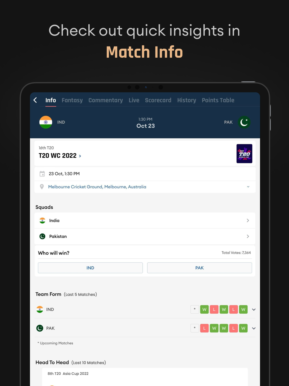 -Fantasy tab provides you all the key insights and analysis for fantasy team creation.