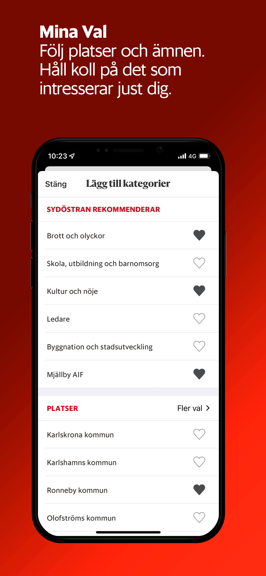 Under Mina val väljer du själv vilket innehåll du vill se i ditt nyhetsflöde. Du kan göra val utifrån geografi och intressen och väljer också om du vill ha pushnotiser så fort det publiceras nyheter i något av de ämnen du valt.