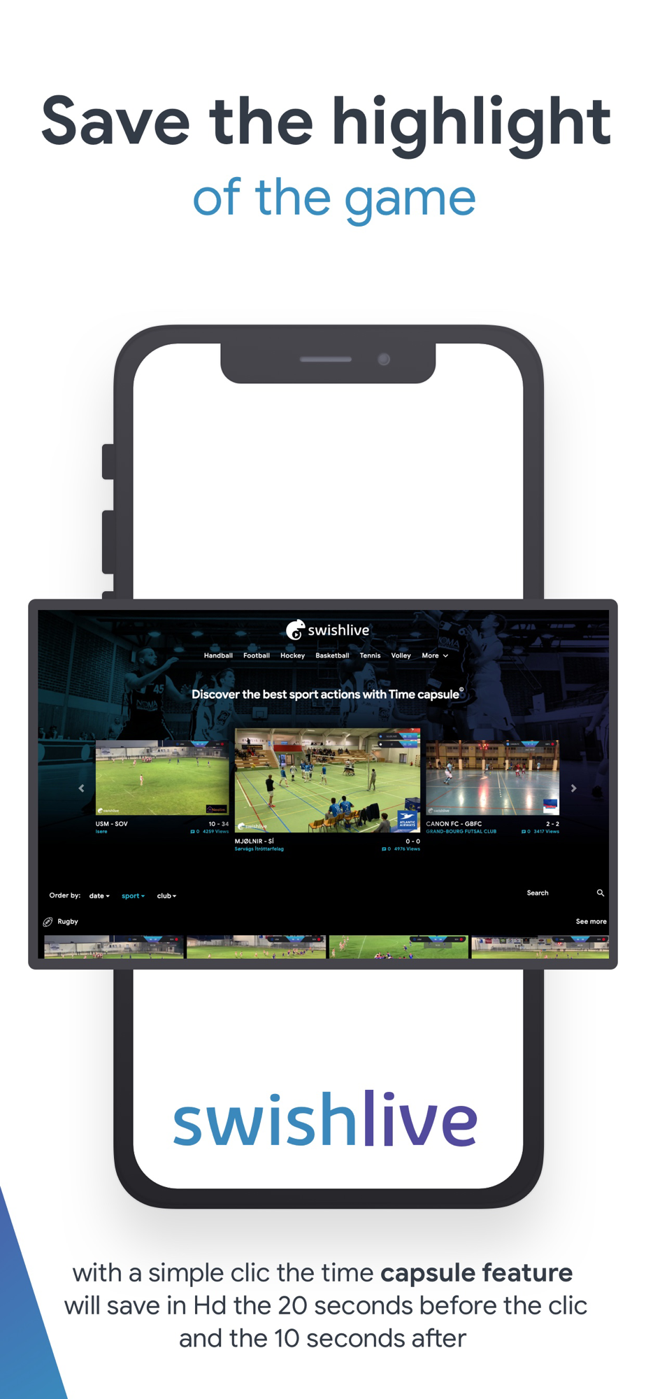 With Swish Live, broadcast your sports events, like on TV, from your smartphone!