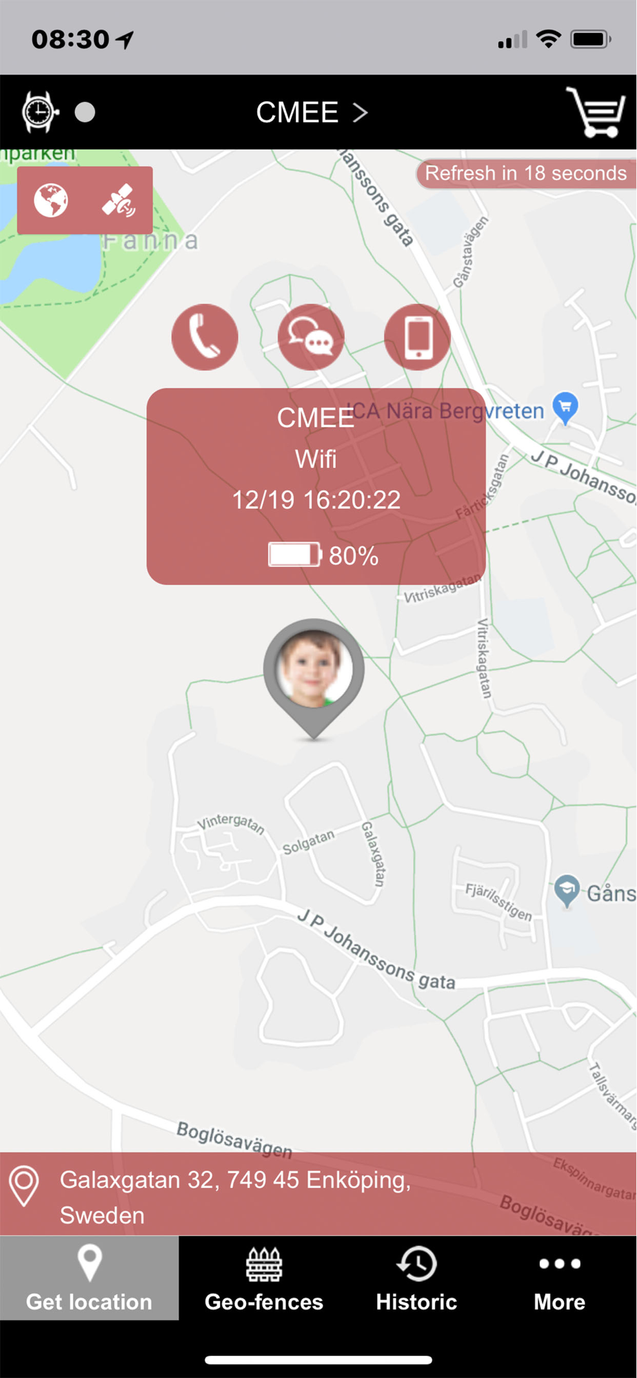 User interfaces are simple and clear. With the invitation from the main account, several app users can share same location of watch, for example both parents can locate the child's position. Features in the app: Map position, calls, camera, send wechat message, time and date, geo fences, APN settings, pedometer, alarm, do not disturb, SMS alerts, phonebook, silent, vibration, silent mode and more. Developed under the brand name Cmee by Spectrafence.
