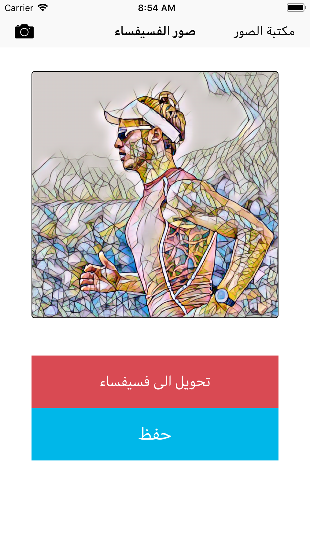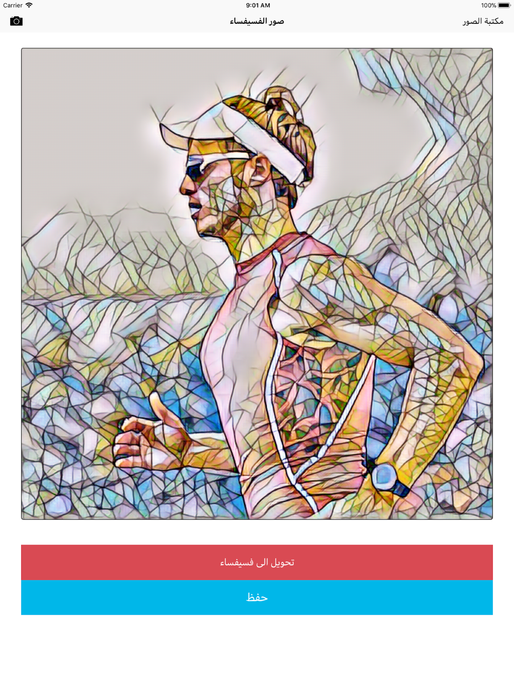 ببساطة اختر صورة من ملف الصور او التقط صورة جديدة بالكاميرا و من ثم اضط زر التحويل الى فسيفساء و قم بحفظ النتجية
