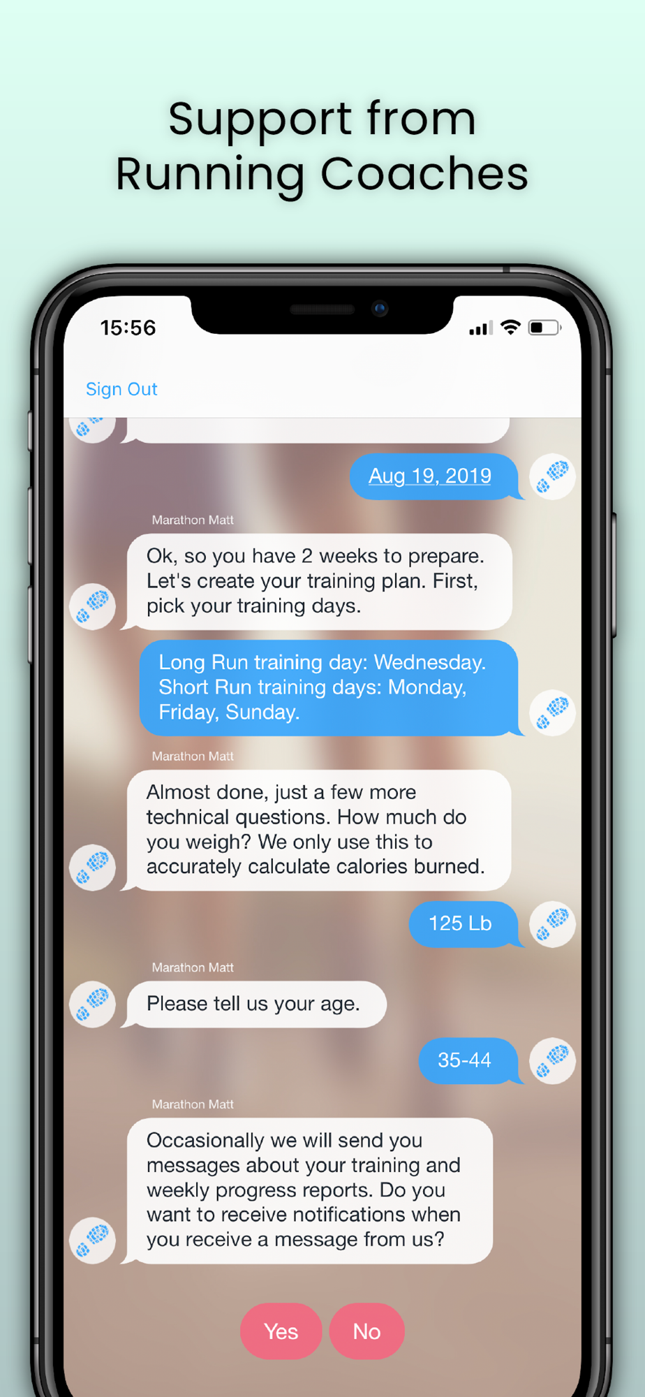 • Notifications, to remind you to run and to let you know when our trainer sends you a message;
