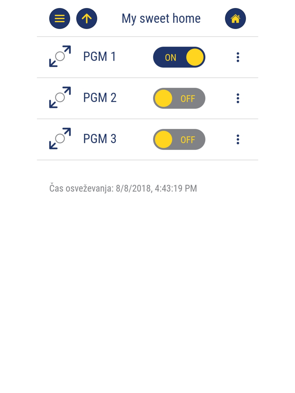 • Nadzor alarmnega sistema. Aplikacija prikazuje status sistema in s potisnimi sporočili obvešča o vsakem dogodku.