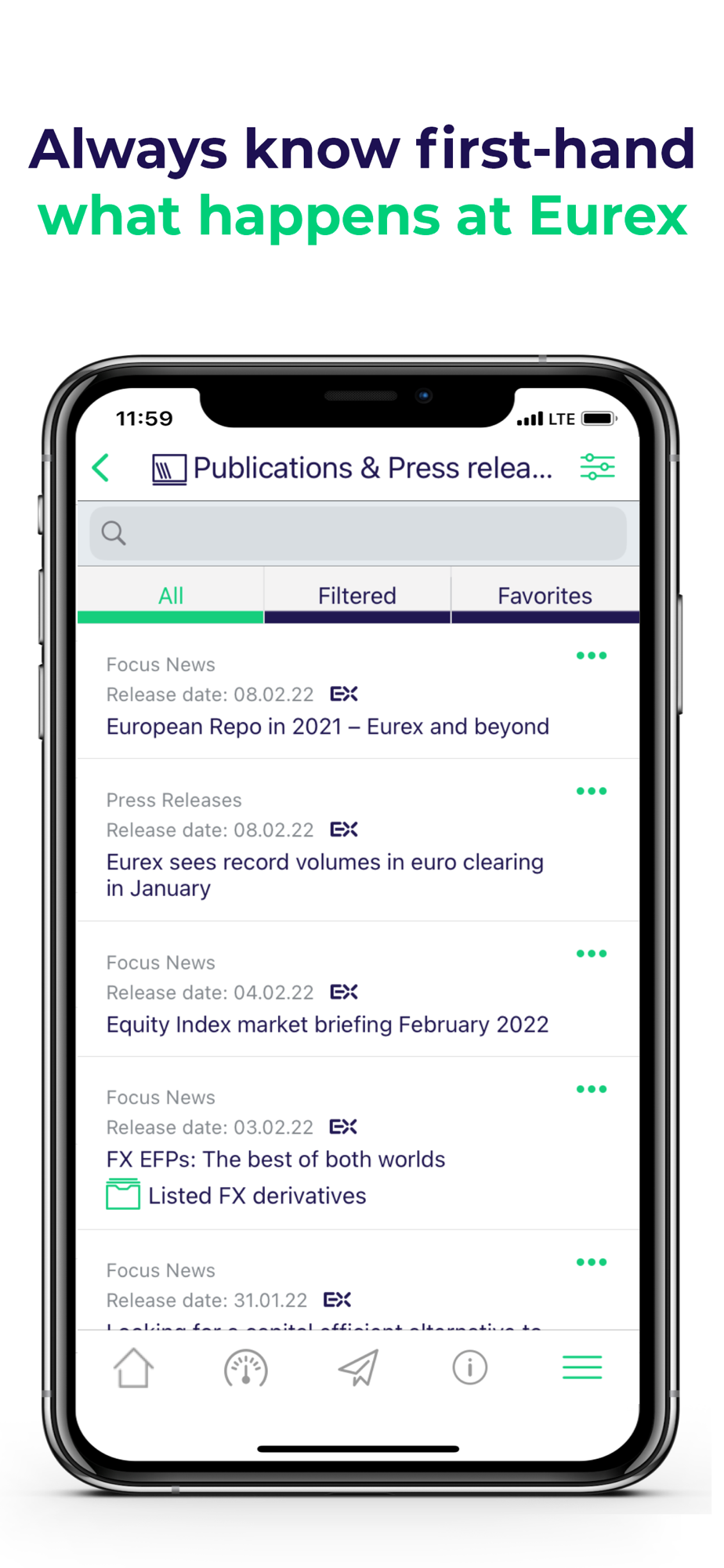 Stay always up to date when you are on the go. Use the Eurex app for quick and informative updates on Eurex Exchange and Eurex Clearing news, circulars, emergencies, publications, system status, events and much more.