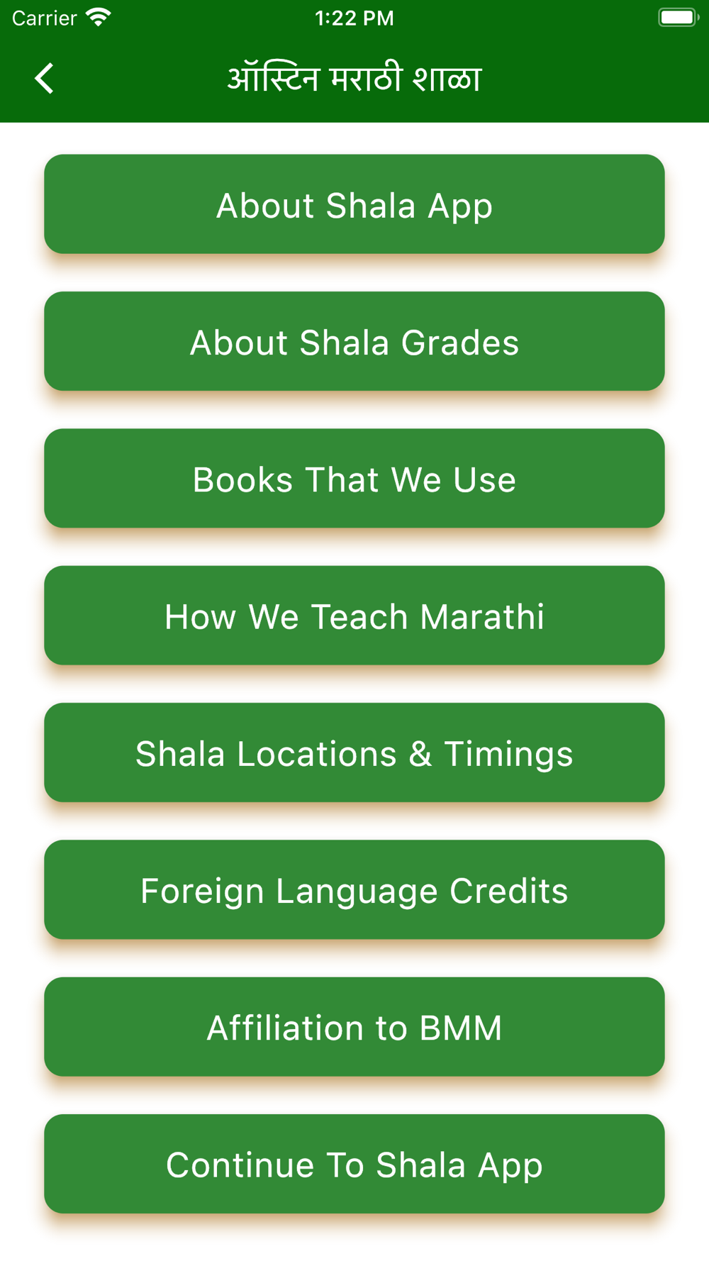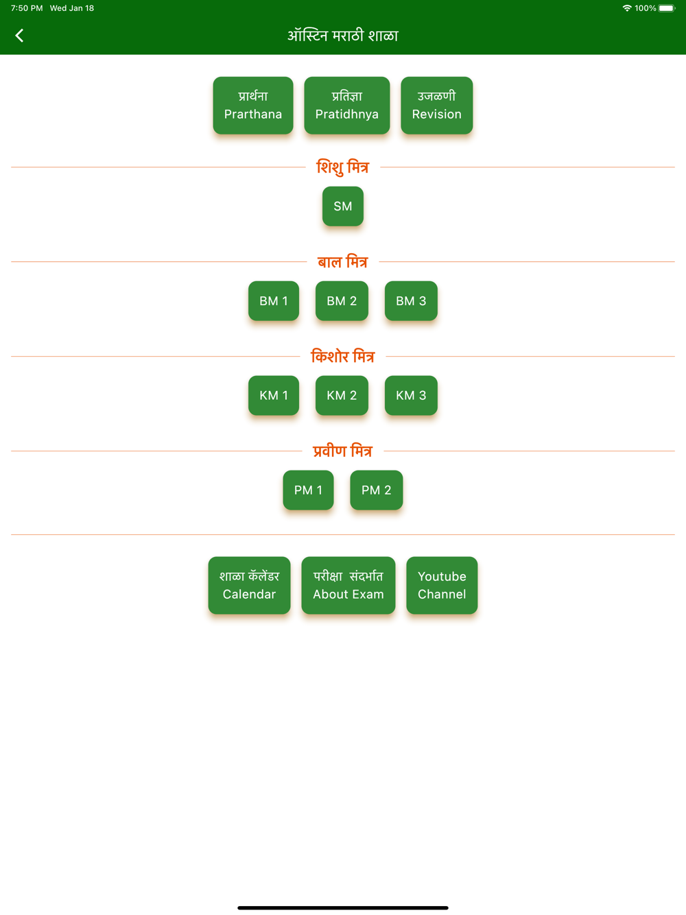 This 'Austin Marathi Shala' application will help parents/teachers pace their teaching based upon student's leaning capability. Each grade will follow respective Syllabus and teachers will be expected to cover this syllabus in a time span of 12 weeks/semester pattern. The application has revision material along with sample reading material & oral / written exam papers for each grade, to promote familiarity with exam pattern and overall structure of the curriculum.