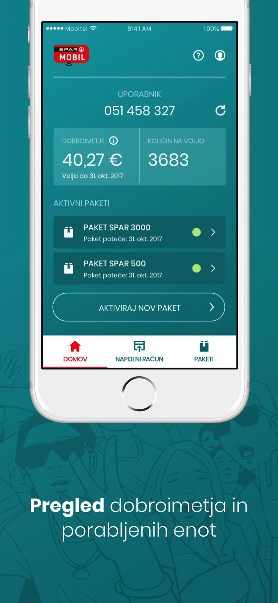 • znotraj aplikacije si lahko vključite vse pakete, ki jih ponuja predplačniška telefonija SPAR MOBIL,