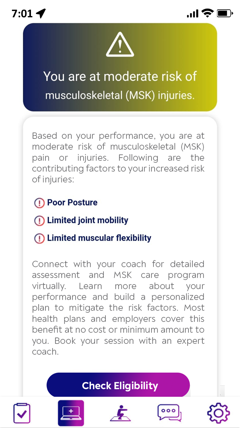 With TheraNow, employees and health plan members can use our computer-vision technology and AI to conduct comprehensive risk-profiling of possible musculoskeletal injuries and prevent them from happening. Members with higher risk profiles can access 1-on-1 live sessions with expert, board-certified physical therapists or health coaches for personalized care. The app also provides users with app-based home exercise programs and tracks progress for compliance and recovery.