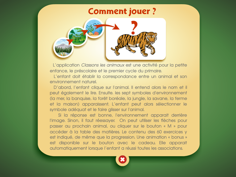 Classons les animaux est une activité pour la petite enfance, le préscolaire et le premier cycle du primaire. L'enfant doit établir la correspondance entre un animal et son environnement naturel, la maison, la ferme, la forêt boréale, la mer, la savane ou la jungle. Le tout est abondamment illustré en son et en image.