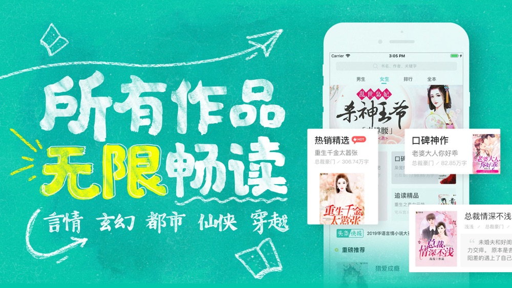 【内容齐全】:玄幻、都市、言情、武侠、科幻、军事、职场励志,应有尽有;