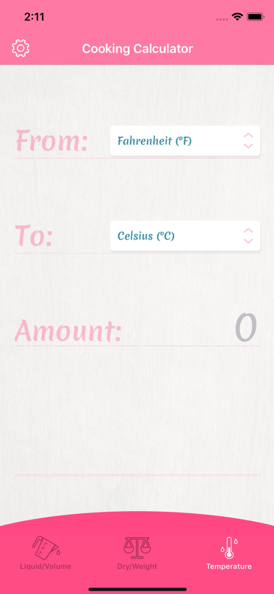 * Supports volume, weight, and temperature conversions