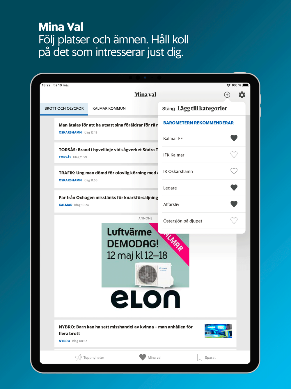 Under Mina val väljer du själv vilket innehåll du vill se i ditt nyhetsflöde. Du kan göra val utifrån geografi och intressen och väljer också om du vill ha pushnotiser så fort det publiceras nyheter i något av de ämnen du valt.