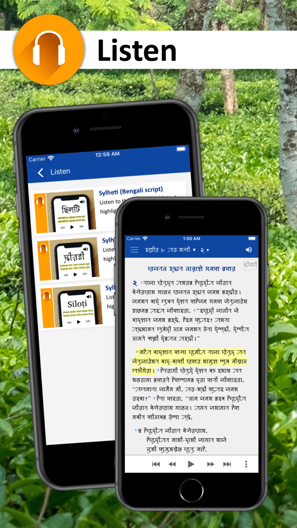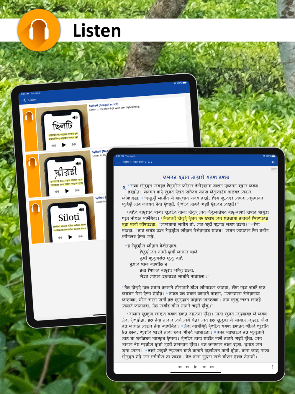 Audio of the Sylheti translation is available for every book of the Holy Injil, with phrase by phrase highlighting of the text (Bengali, Sylheti Nagri and Latin scripts) as you listen. It is also possible to slow down or speed up the audio playback (from 0.4x to 1.6x). Audio files can be streamed or downloaded.