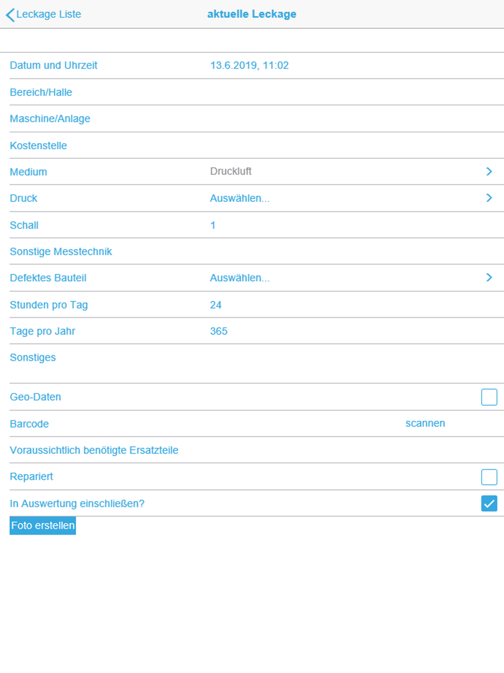Neben der Möglichkeit Fotos anzufertigen, können Sie die Leckagen auch mit einem Barcode versehen.