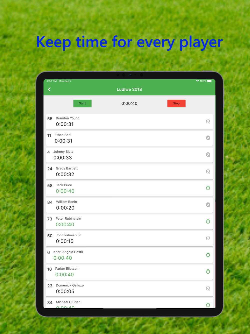 Keep track of playing time to make sure players are not over or under played. Great for Basketball, Hockey, Water Polo etc.