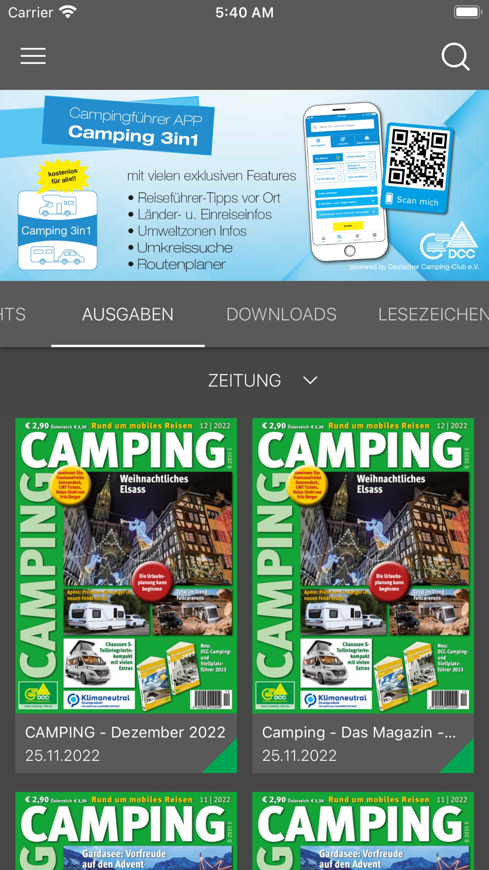 Möchten Sie mehr über das Thema Camping erfahren? Dann sind Sie hier richtig. Die Zeitschrift „CAMPING“ wird vom Deutschen Camping-Club herausgegeben und beschäftigt sich mit allen Themen rund ums Campen. Wollen Sie monatlich Interessantes über Camping erfahren und wollen Sie außerdem immer auf dem neusten Stand bleiben? Die „CAMPING“ auf Ihrem Tablet oder Smartphone sorgt dafür! Immer und überall bekommen Sie so Infos über Campingzubehör, Reiseziele und weiteres Wissenswerte. Die Redaktion hält Sie auf dem neuesten Stand – und zu gewinnen gibt’s auch immer was.