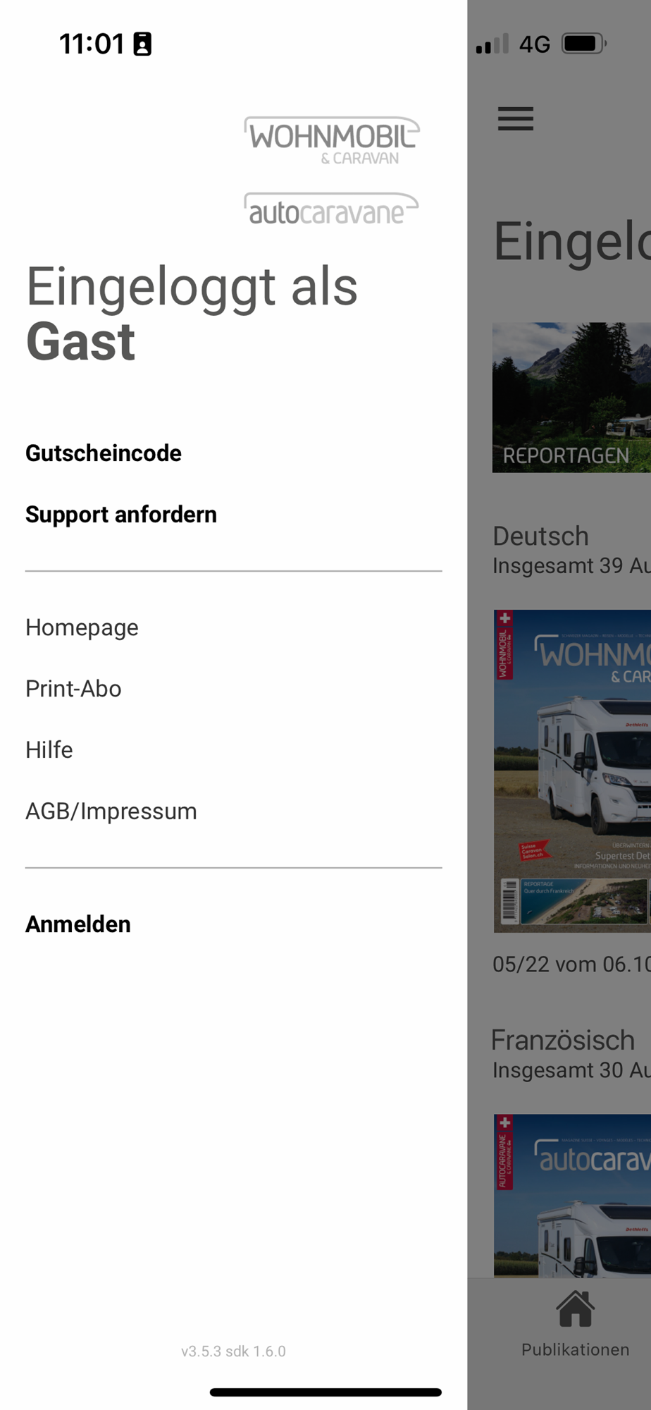 In der App haben Sie aktuell Zugang zu Einzelausgaben der Zeitschrift WOHNMOBIL & CARAVAN / AUTOCARAVANE. Zusätzlich besteht die Möglichkeit, ein Jahresabonnement (fünf Ausgaben) zum Preis von CHF 20.00 zu erwerben, welches sich automatisch erneuert. Das Abonnement ist jeweils in Deutsch und Französisch erhältlich.