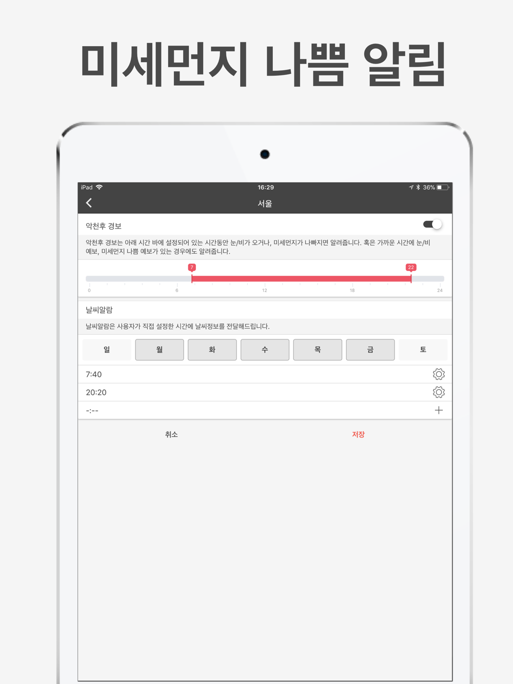 * 푸시 알림(선택) : 날씨 알림/악천후 경보 등 날씨 정보를 푸시 알림을 받을 때 필요합니다.