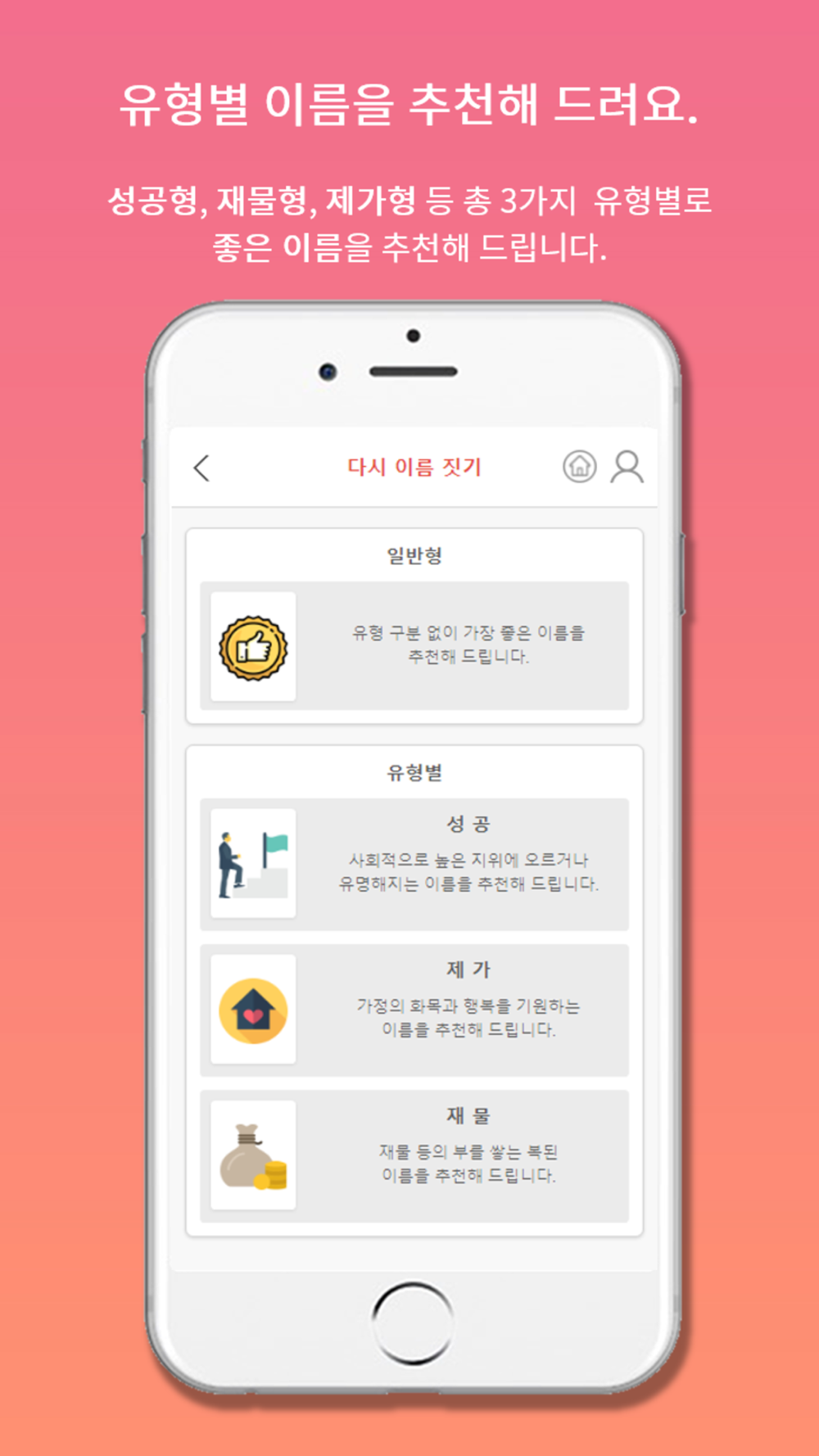 - 성공형, 재물형, 제가형 등 총 3가지 유형별 추천 이름 제공