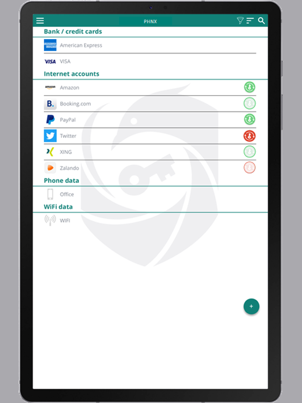 PHNX is a password manager that conveniently manages the passwords for all your accounts “from A for Amazon to Z for Zalando“, and stores them securely in a vault on all your mobile devices. The PHNX Password Manager creates complex and totally secure passwords which can even be changed for you in an automated process for a constantliy increasing number of internet accounts. What’s more, you can, of course, also store other confidential data in your vault: account details, credit card information, Wi-Fi access and telephone codes such as PINs and PUKs.