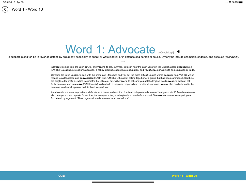 You will proceed through ten levels of vocabulary, each level more challenging than the last. For example, Level 1 contains words familiar to about 60 to 70 percent of adults—that is, words known to many high school graduates and most college graduates. By the end of Level 5 you will have raised your vocabulary to about the 75th percentile—the top quarter of all educated adults. By the end of Level 8 your vocabulary will have surpassed that of most executives and professionals, including those with advanced degrees. And when you complete the tenth and final level you will have progressed beyond 95 percent of the entire population. You will command an armory of words that only a handful of people in every thousand can match.