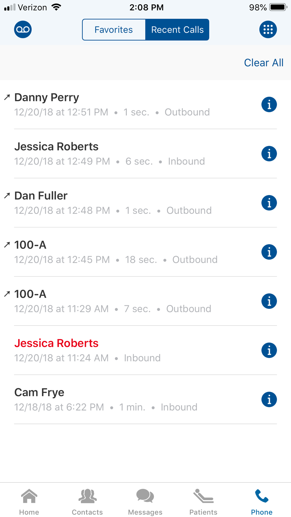·Recent calls list with voicemail and a user-created list of favorite contacts