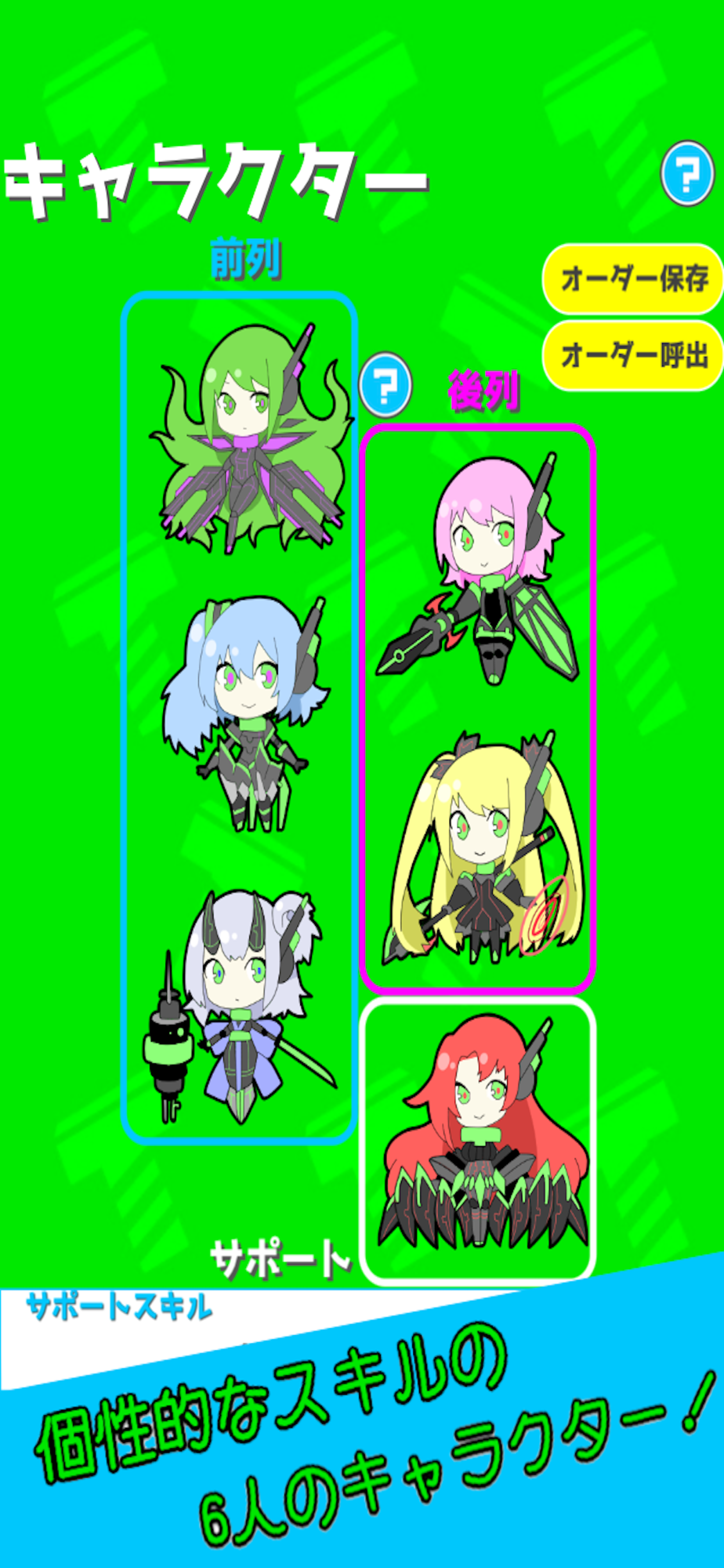 キャラクターたちは戦闘中に発動するスキルはもちろん、戦闘に参加させないことで発動する「サポートスキル」も持つ。サポートスキルはチーム全体が受けることができ、戦略に大きく影響する。君の好きな戦い方を選ぼう!