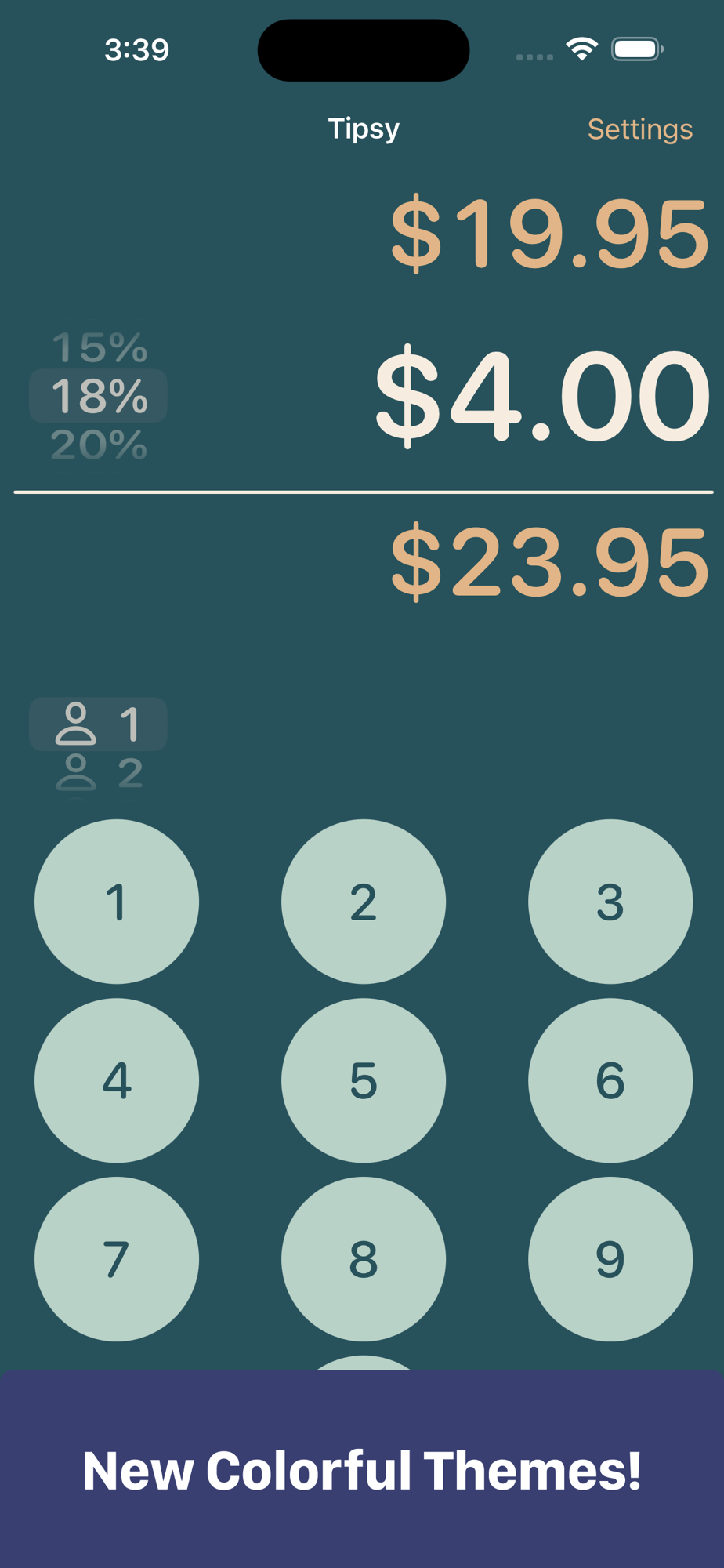 Tipsy’s iPhone keyboard is always onscreen and ready to type, just start entering the amount of your check. Spin the tip wheel up and down to quickly calculate different tip and total values.