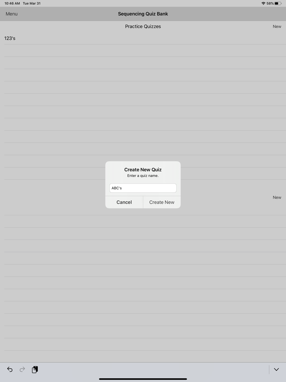An administrator password is created when the app is first installed. This password is required to get into the quiz bank to add or edit quizzes. Quizzes can be shared from the quiz bank to other apple devices that have Sequence Quiz installed on them.