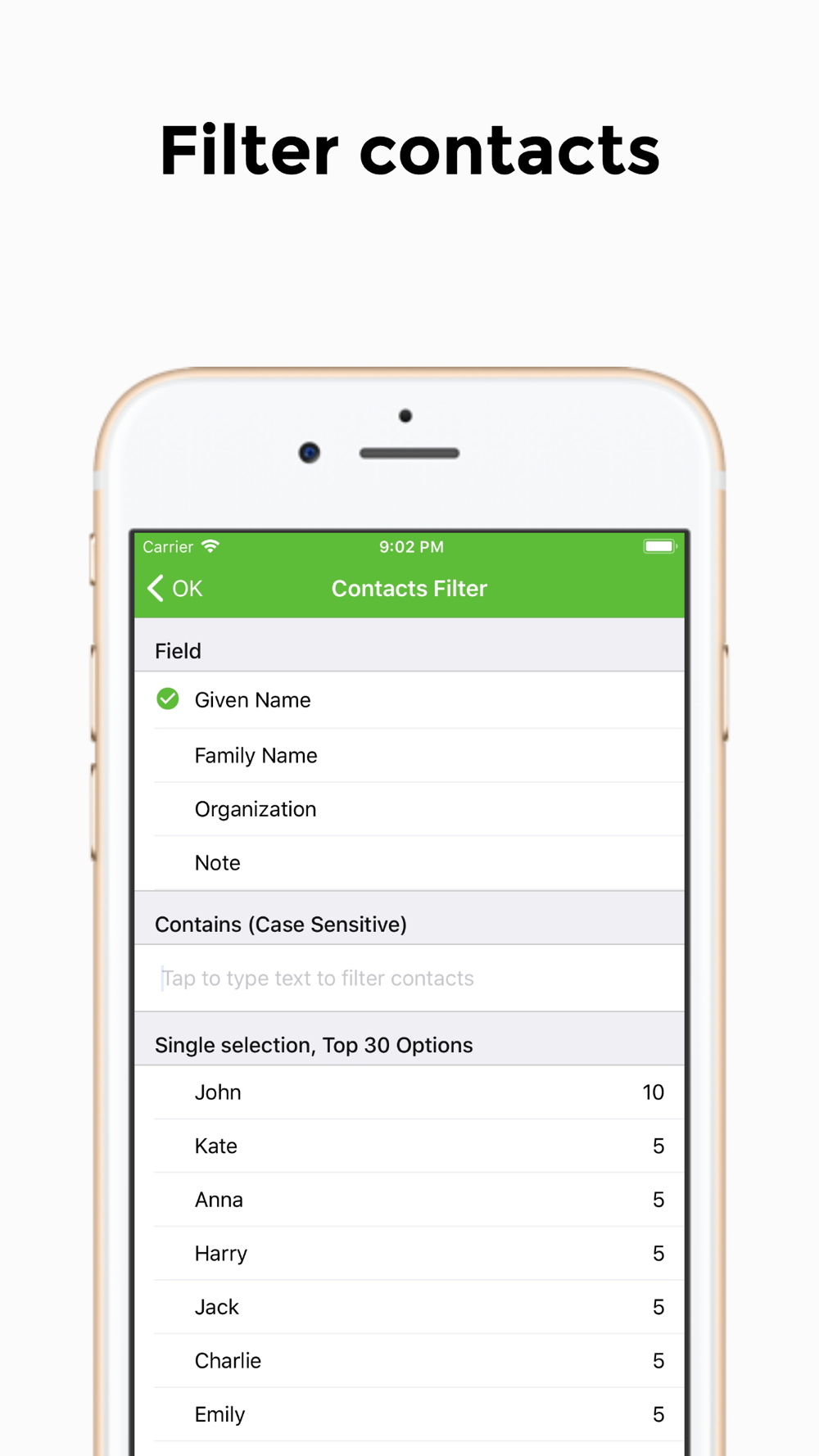 Default option is export all contacts, you can add filter to find contacts that contain target text.