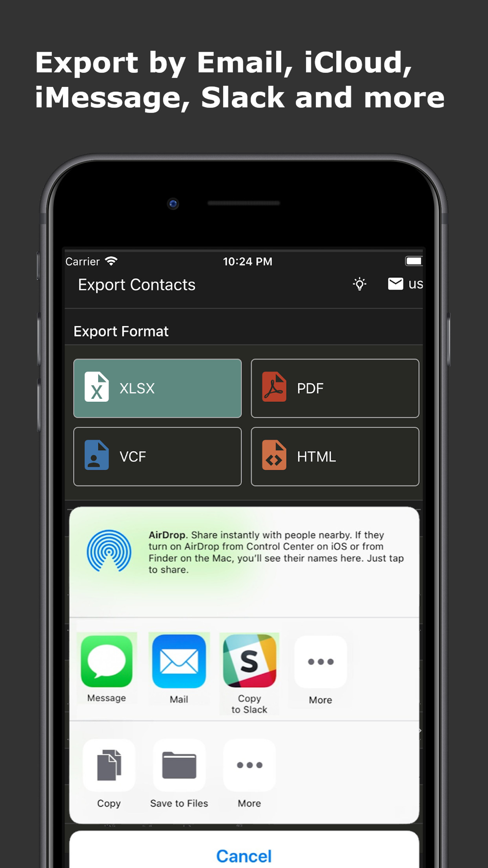 Send exported file by using iMessage, Email, iCloud, Slack, AirDop, Google Drive, Dropbox and others.