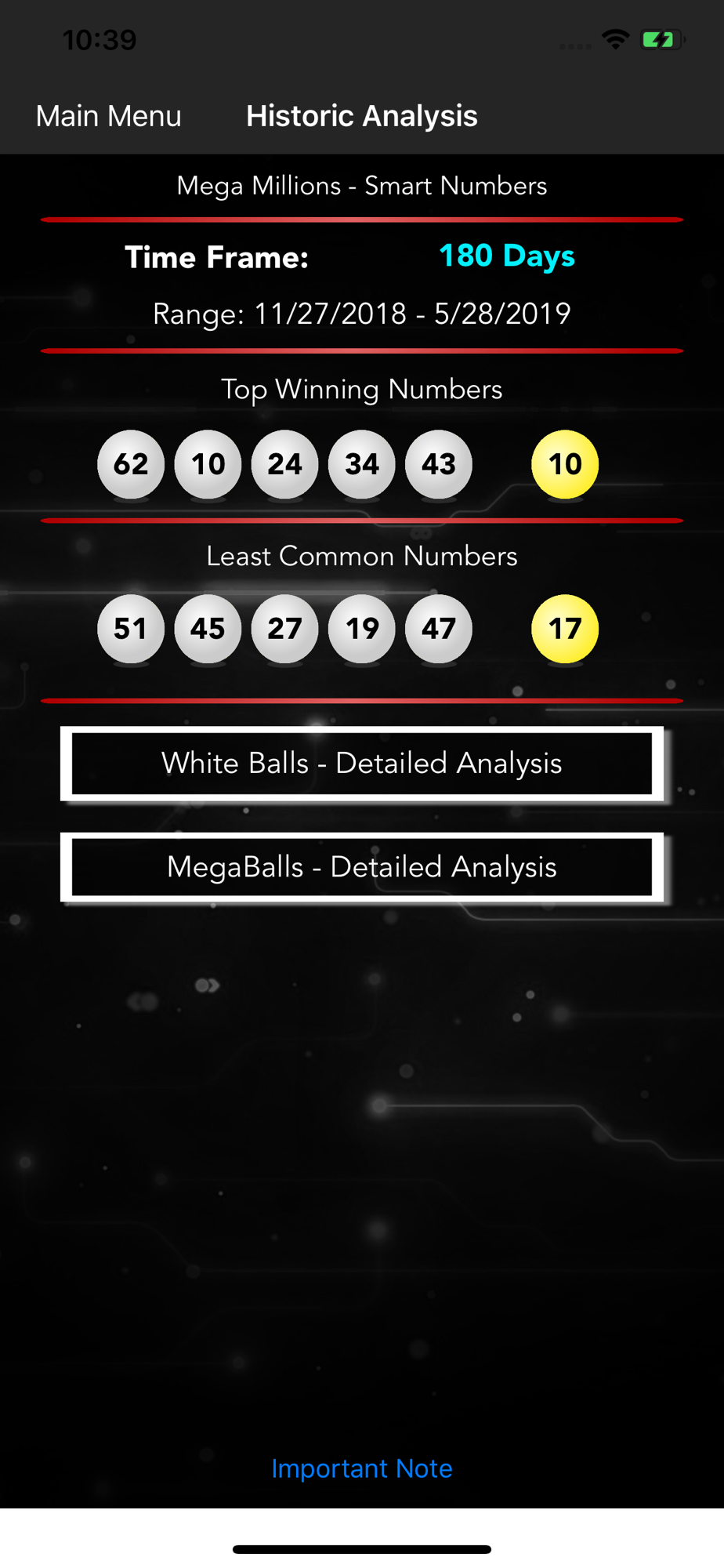 This app allows you to make SMART decisions when selecting numbers for your next Mega Millions drawing. We provide you with a detailed analysis of the most common jackpot numbers for every drawing in the last 10 years. This app retrieves the latest drawing results in real time.