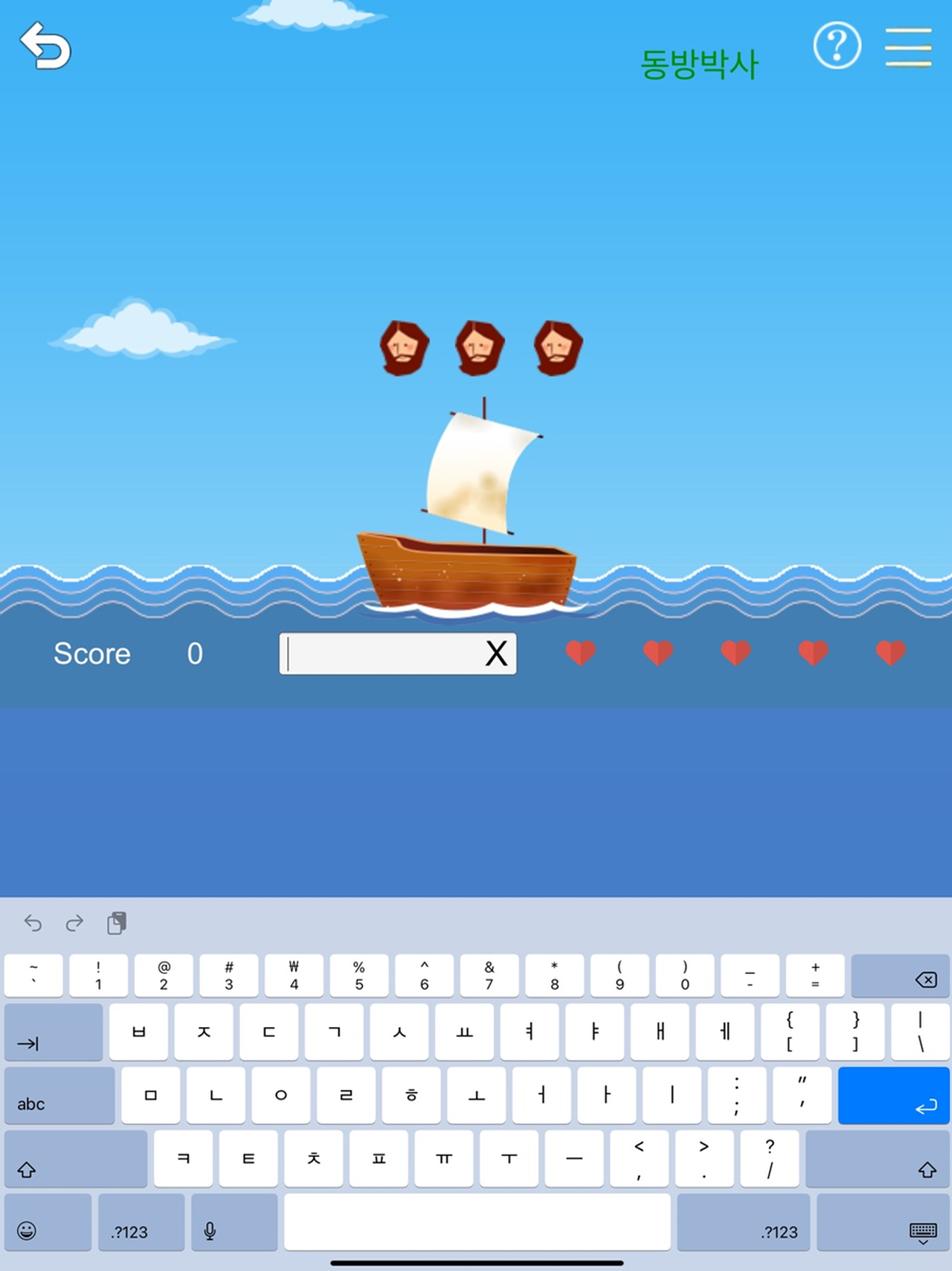 - 성경의 예수님, 성품, 인명, 지명, 요한계시록의 단어가 갈릴리 바다에 떠있는 배 위로 떨어집니다. 단어가 바닷물에 빠지기 전애 단어를 입력하면 점수가 올라갑니다. 많은 단어가 한꺼번에 내려와서 미처 입력하지 못한 단어들이 생기면 5개의 하트가 하나씩 줄어들면서 수위는 높아지고 배는 침몰위기에 처합니다. 이때, 예수님 아이콘을 크릭하면 “바다야 잔잔하라”는 글씨와 함께 수위는 다시 낮아 집니다. 예수님 찬스는 3회가 주어지면 다쓰게 되면 게임이 종료하게 됩니다.