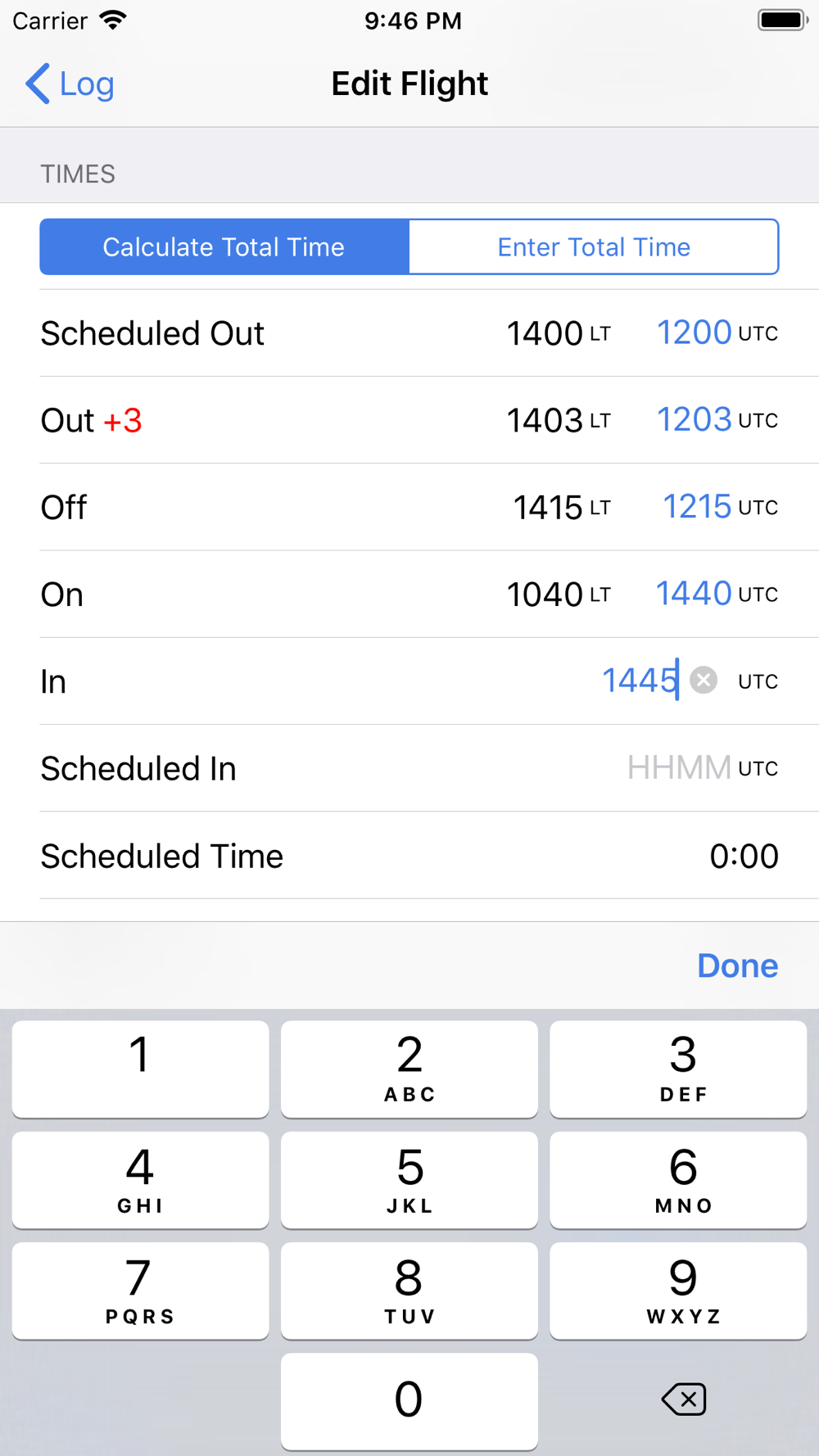 Enter your basic flight information, such as crew, aircraft, airports, SCHEDULED OUT, OUT, OFF, ON, IN and SCHEDULED IN times, and the app automatically calculates PIC, SIC, PICUS, IFR, MULTI-PILOT, FLIGHT, TOTAL, SCHEDULED, ENGINE TYPE, CROSS-COUNTRY, DUAL, SOLO, INSTRUCTION, NIGHT times...