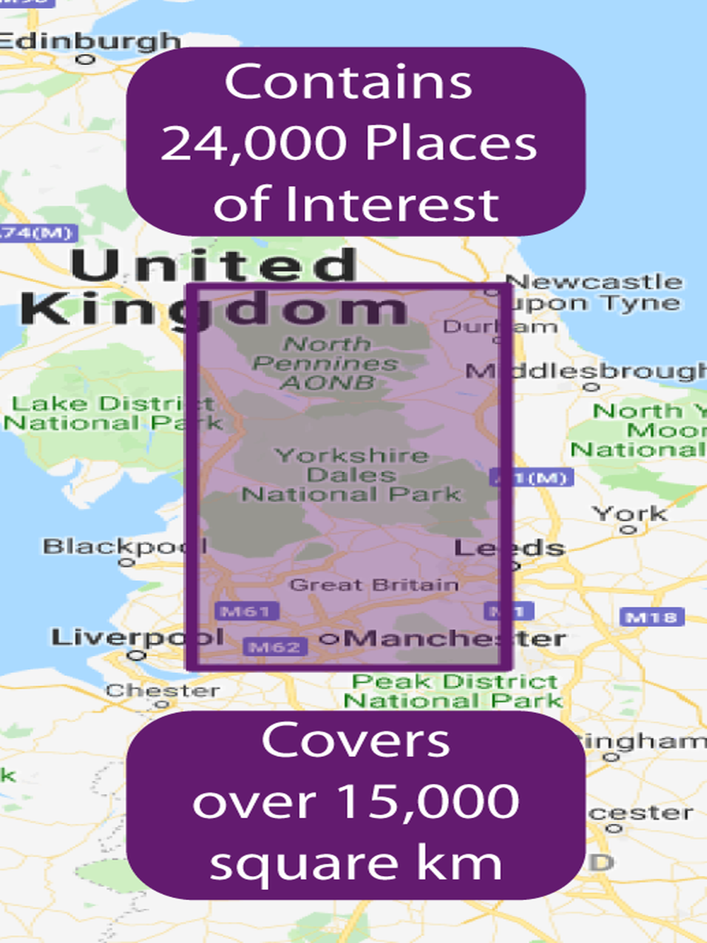 The Pennines, also known as the Pennine Chain or Pennine Hills, are a range of mountains and hills in England separating North West England from Yorkshire and North East England. This App encompasses the whole region and reaches a rectangle stretching from and including Newcastle upon Tyne in the North East to Warrington in the South West, an area of over 15,000 km2. It encompasses the Yorkshire Dales National Park and Nidderdale, the Forest of Bowland and North Pennines Areas of Outstanding Natural Beauty (AONBs). It also the cities and towns of Manchester, Warrington, Bradford, Preston, Huddersfield, Durham and Kendal.