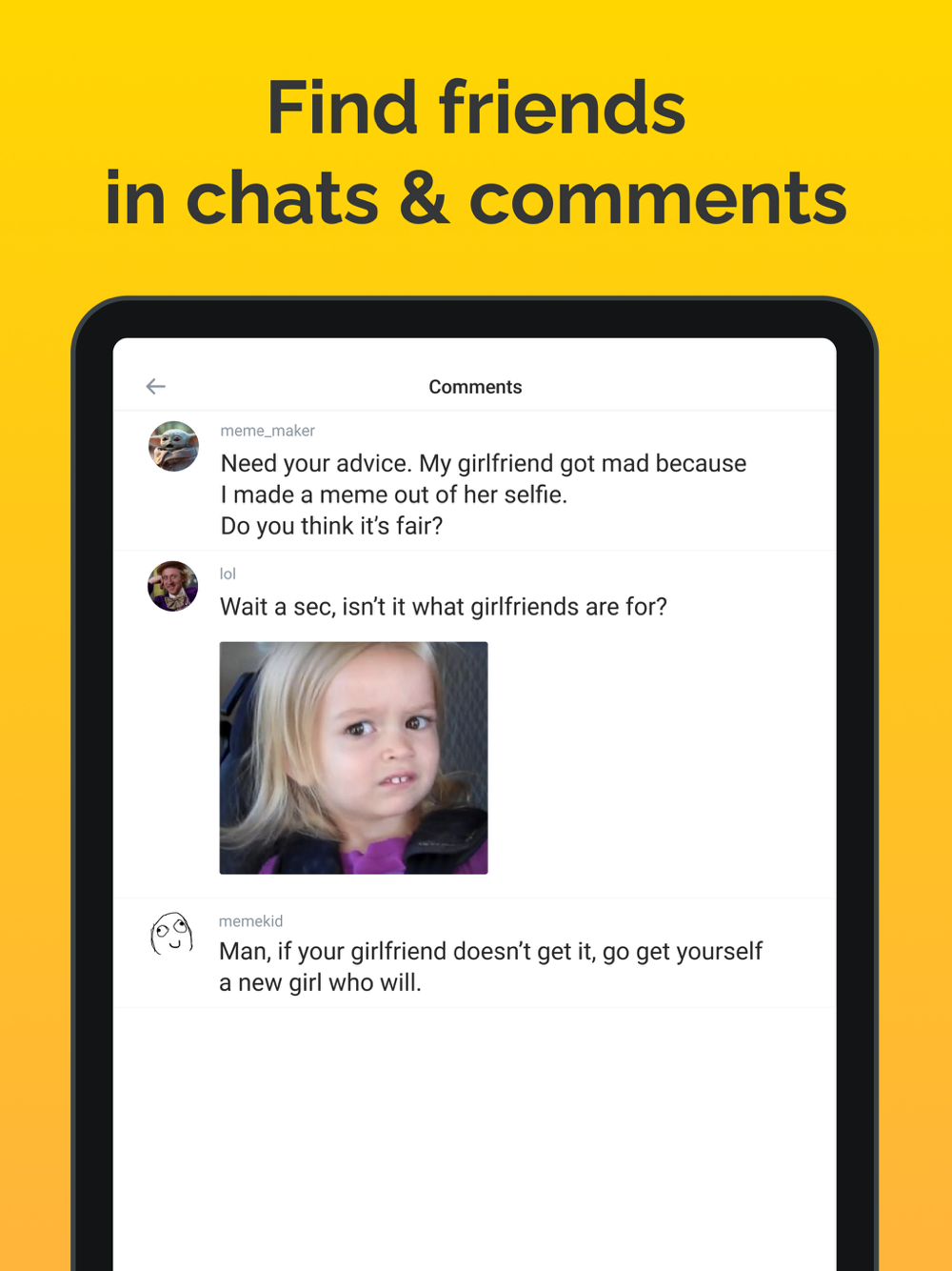 Here you can find thousands of users to share your passion for funny meme jokes, fake news memes, TV show memes, movie memes, and, of course, game memes. You are free to follow users you find interesting, get your funny memes, comment on meme topics, search for advice and so on. Besides, you can make your own feed by following your favorite submemasiks.