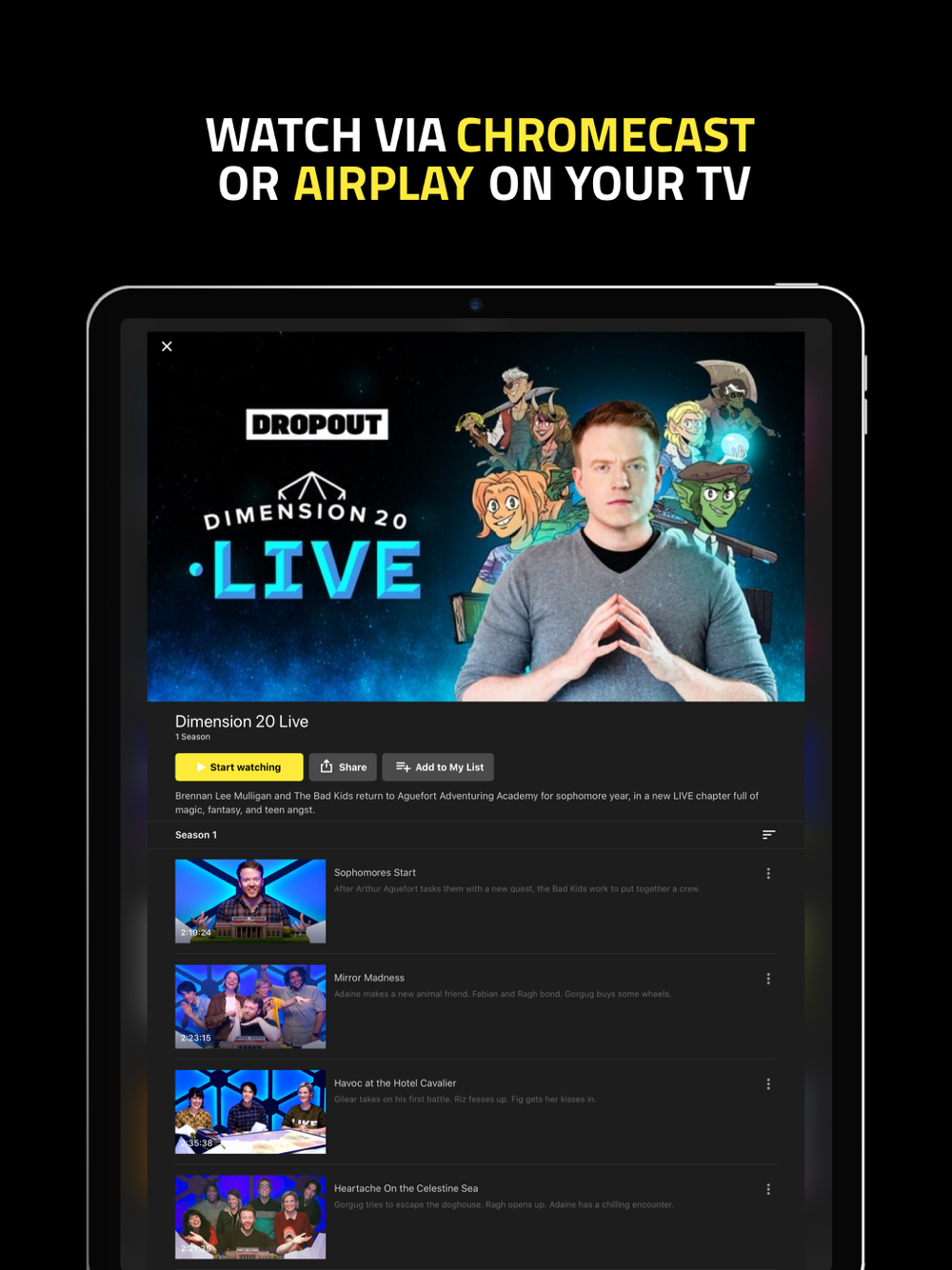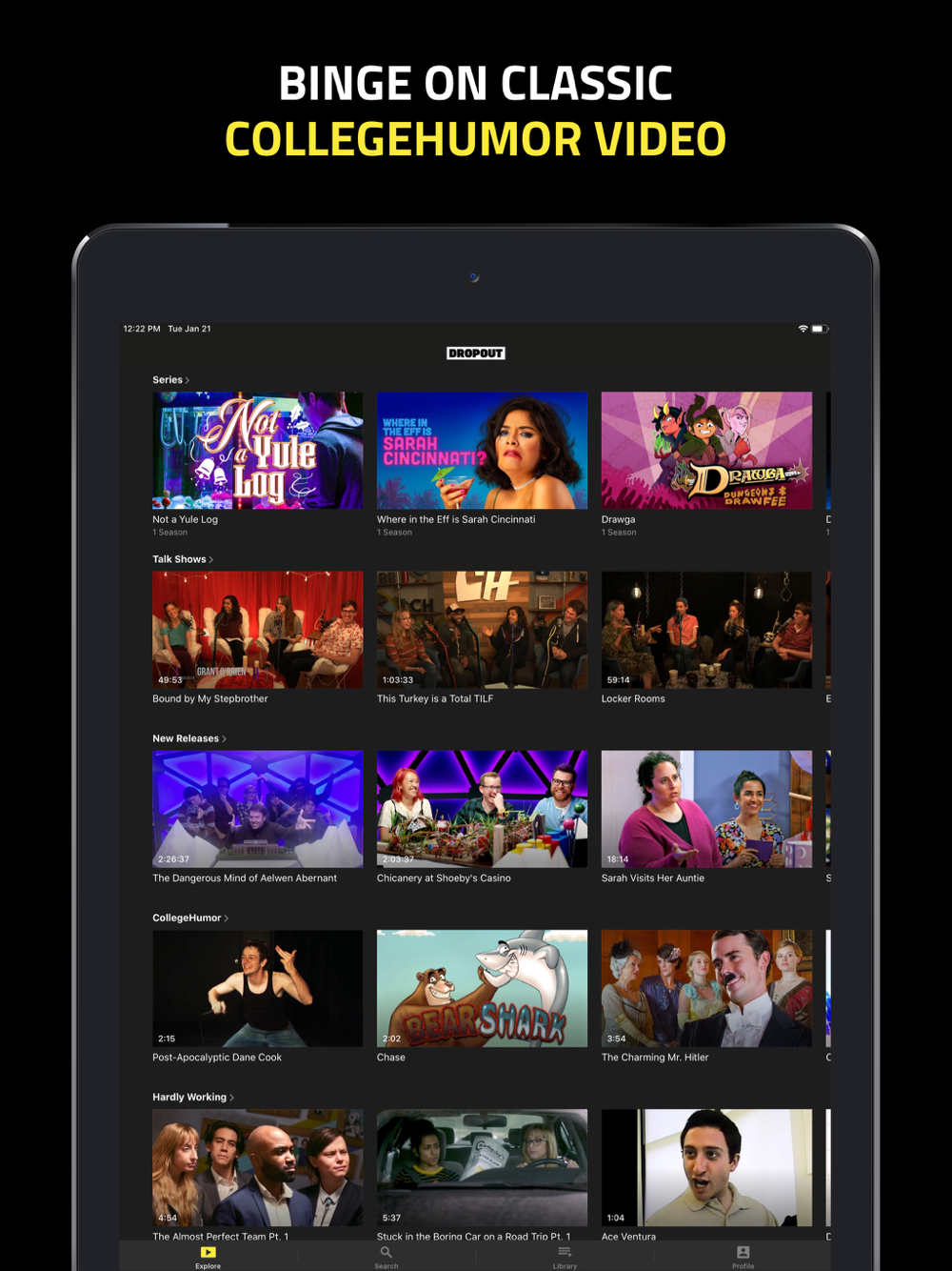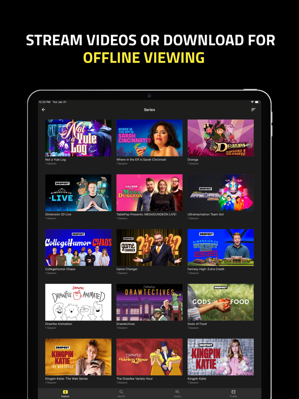 On DROPOUT, stream exclusive shows, watch every new CollegeHumor, Dorkly and Drawfee video first, and binge the library of classic sketches.
