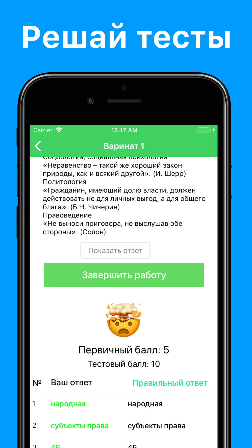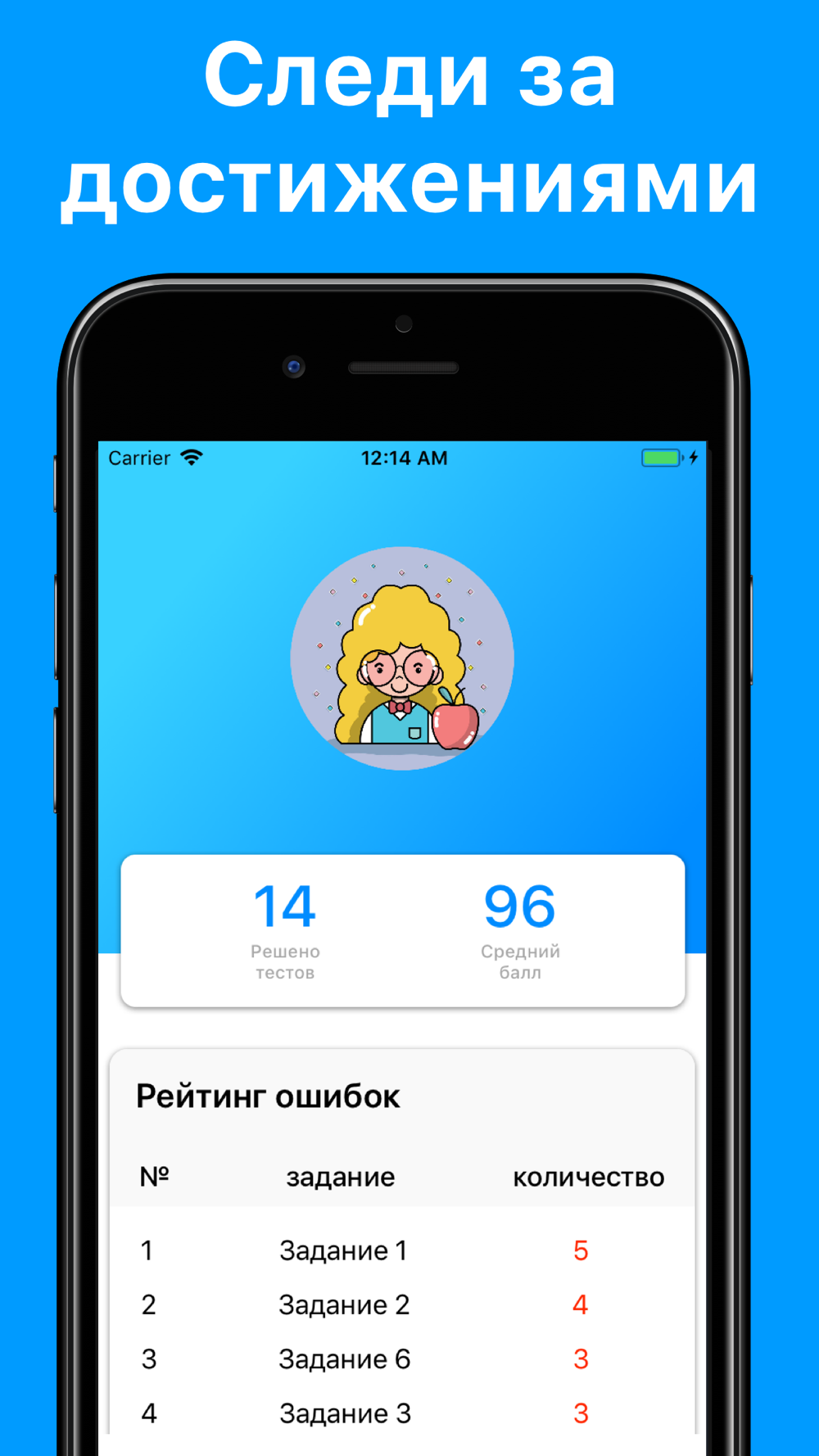 - Приложение ведет статистику решения тестов.