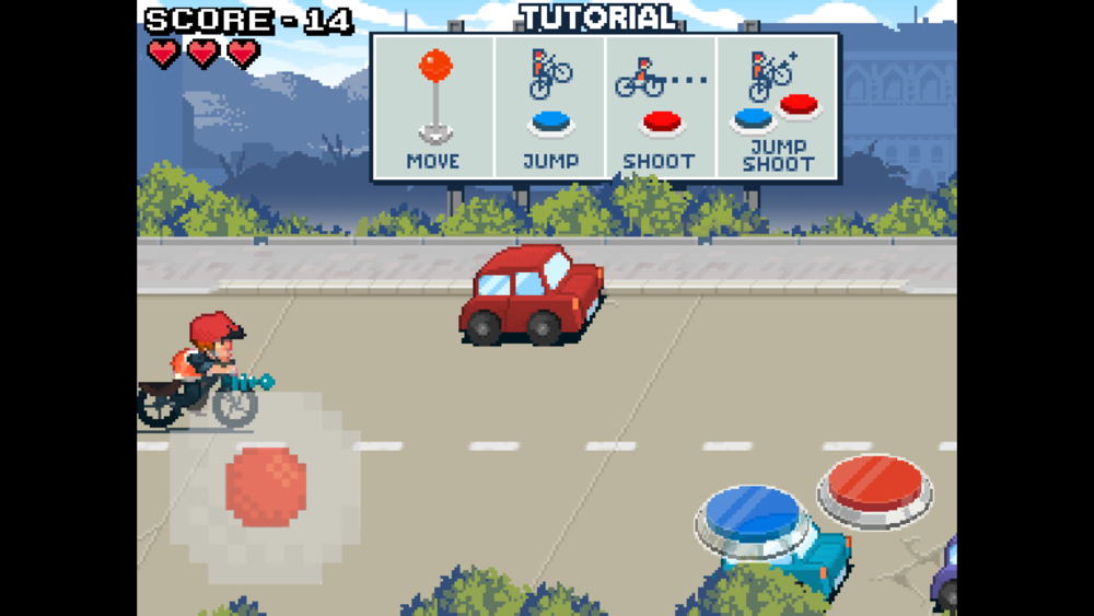 Armed with nondescript overalls, an increasingly fast bike, camouflage safety vest, and a helmet granting 3 lives, our hero is geared up for battle.