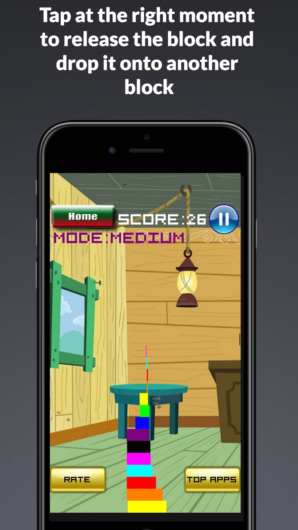 It is a fun strategy game for all ages. The object is to build a tower from the colored boxes as tall as possible. The boxes will quickly move left and right across the screen. Players must tap at the right moment to release the block and drop it onto another block. The timing of the drop is important.
