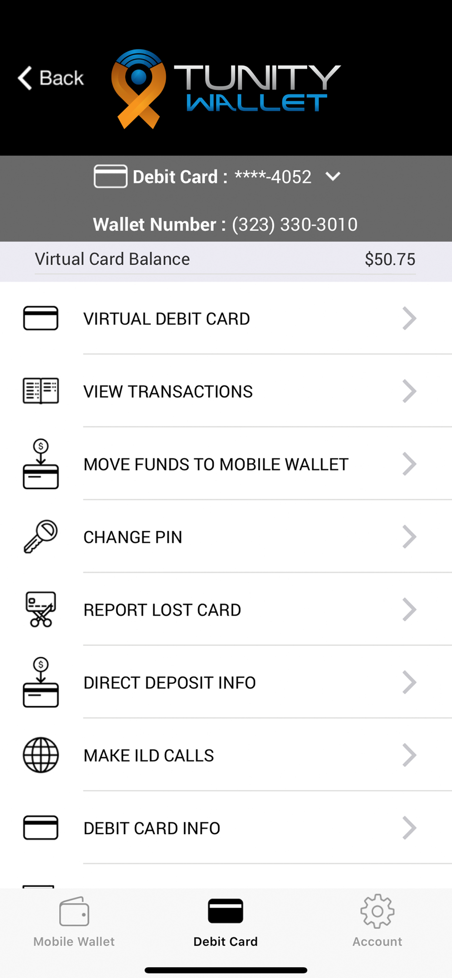 Tunity Services allows its customers to securely manage their wireless services as well as their Tunity Services mobile wallet and debit card account. The application includes functionalities such as real time account balances, real-time money movement, loading and offloading of funds, and Tunity wireless service account management and replenishment.