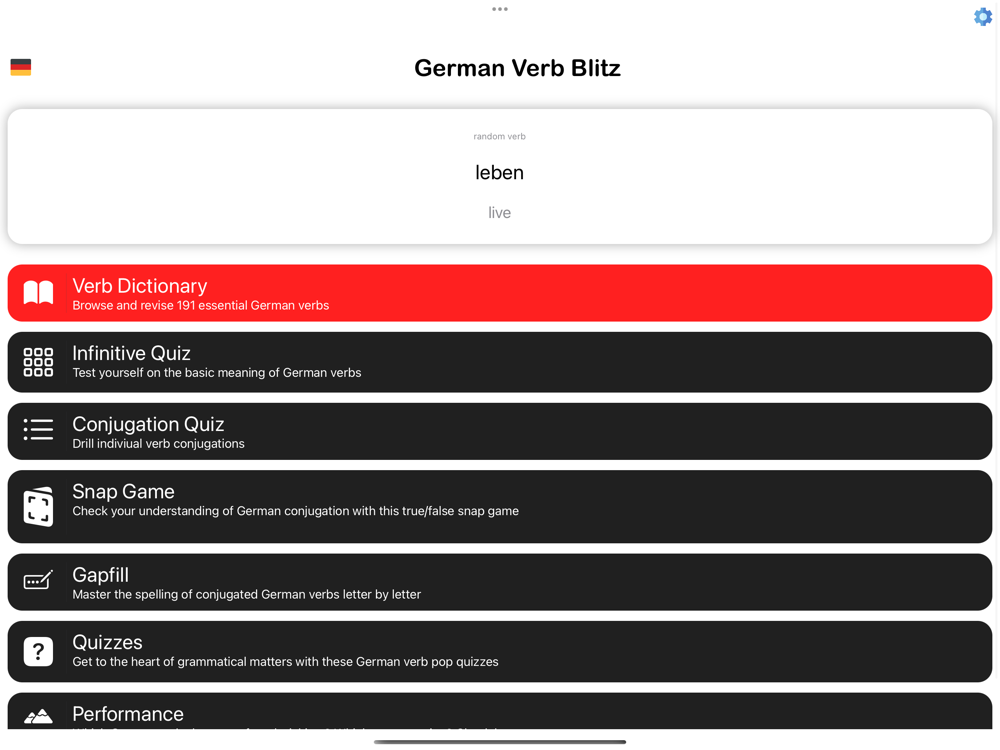 Learn and practise German verbs with this interactive verb reference and drill tool. With over 180 core verbs across tenses, German Verb Blitz is a clear and effective way to refresh and revise your grammar skills as well as expand your everyday vocabulary.