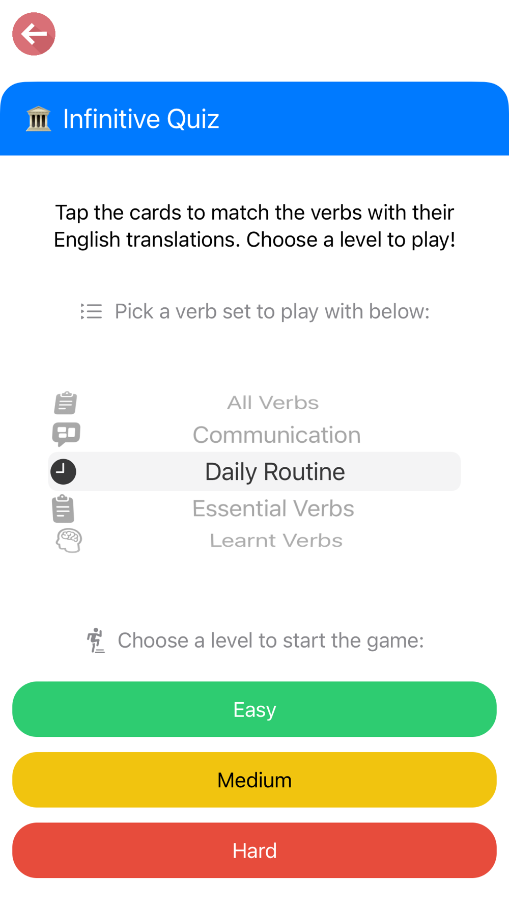 In the settings, you can select which tenses to drill in the games. So whether you're a beginner, or already on the way to mastery, there's a level for you!