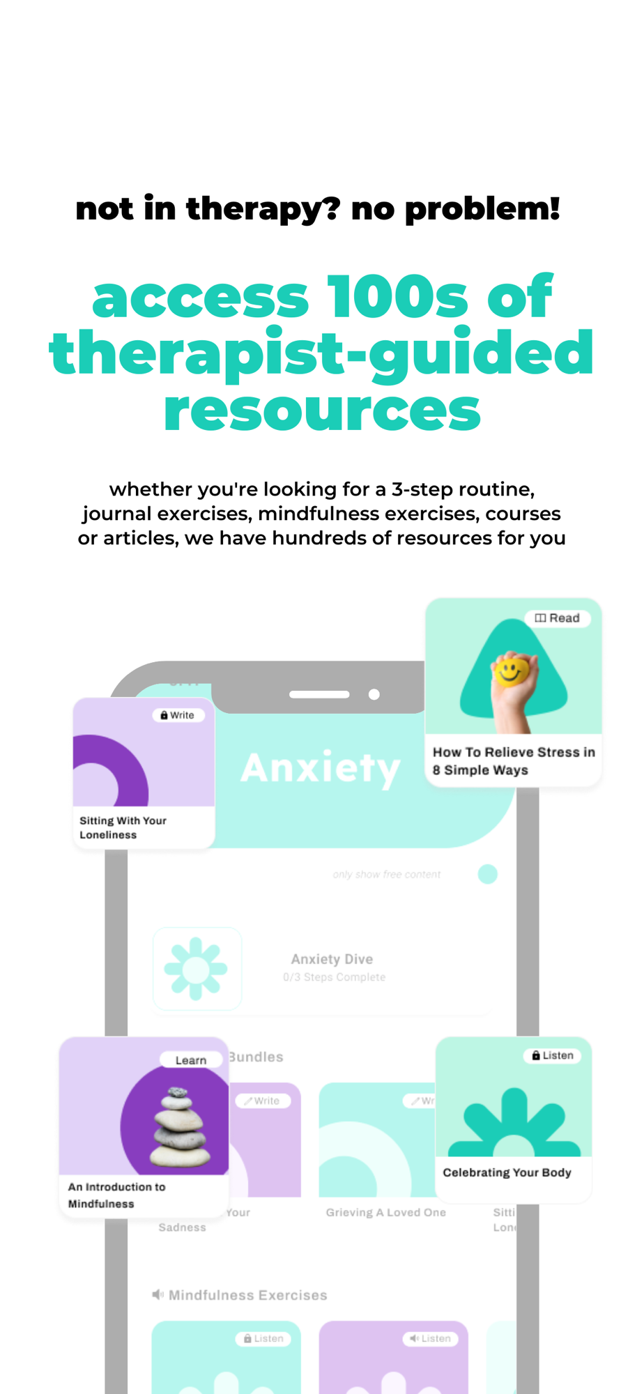 The DiveThru app is filled with hundreds of tools created by licensed therapists that are designed to help you lead a mentally healthier and more fulfilling life. These resources include: