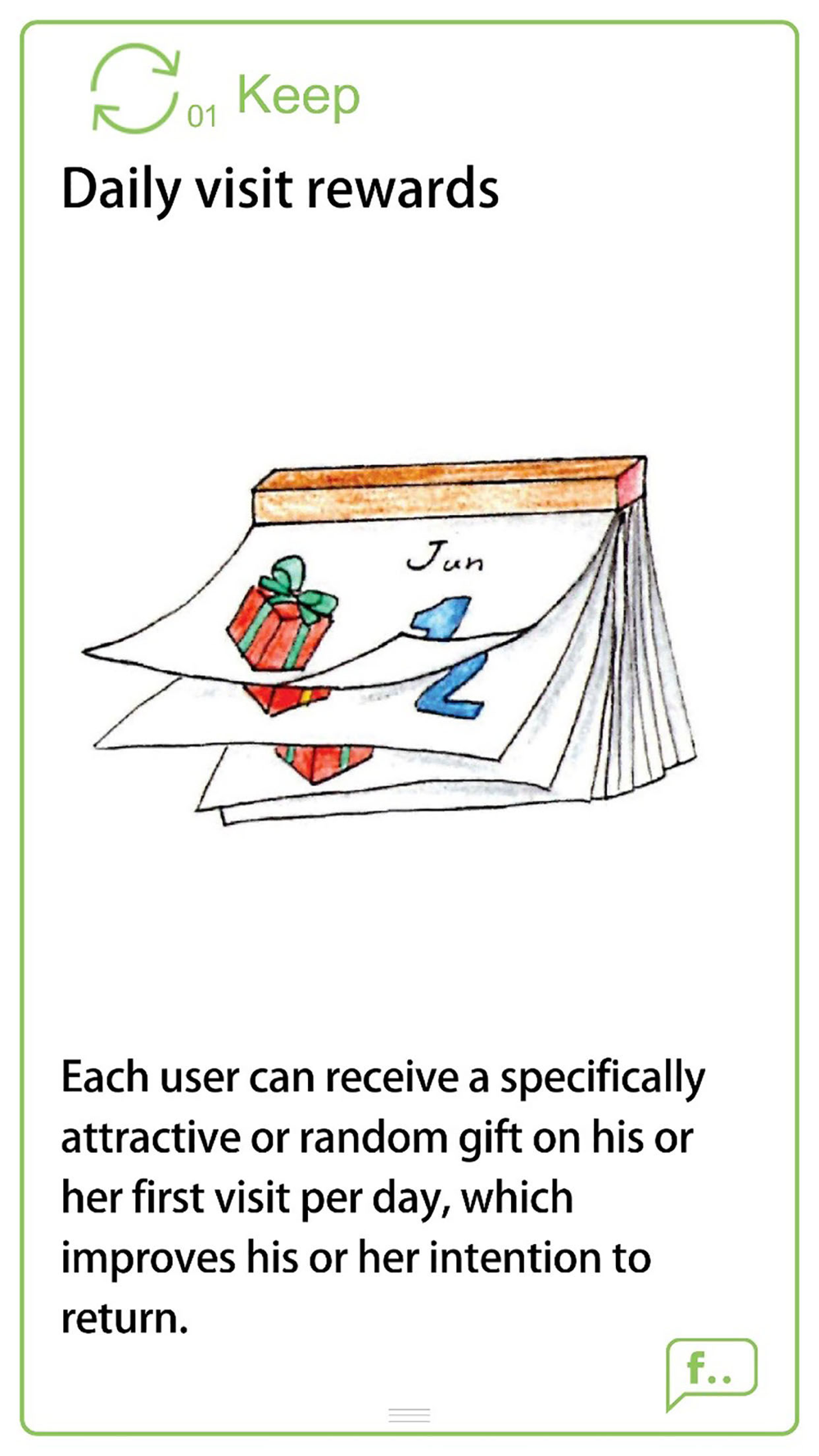 The gamification design card is one of the designer’s hand card series, and this set of cards applies interactive mechanisms in the game of operations and marketing of the network service. The designer’s gamification cards will be divided into four stages in total. Each stage includes 13 cards which are used to guide the designer to apply the gamification design technique to achieve: attraction (attract customers to join), engagement (delighting the customers), retention (increasing customer loyalty), and monetizing(guiding customers to pay). The effective addition of the gamification method card to the network service may improve the quality of the operation and marketing of the network services.