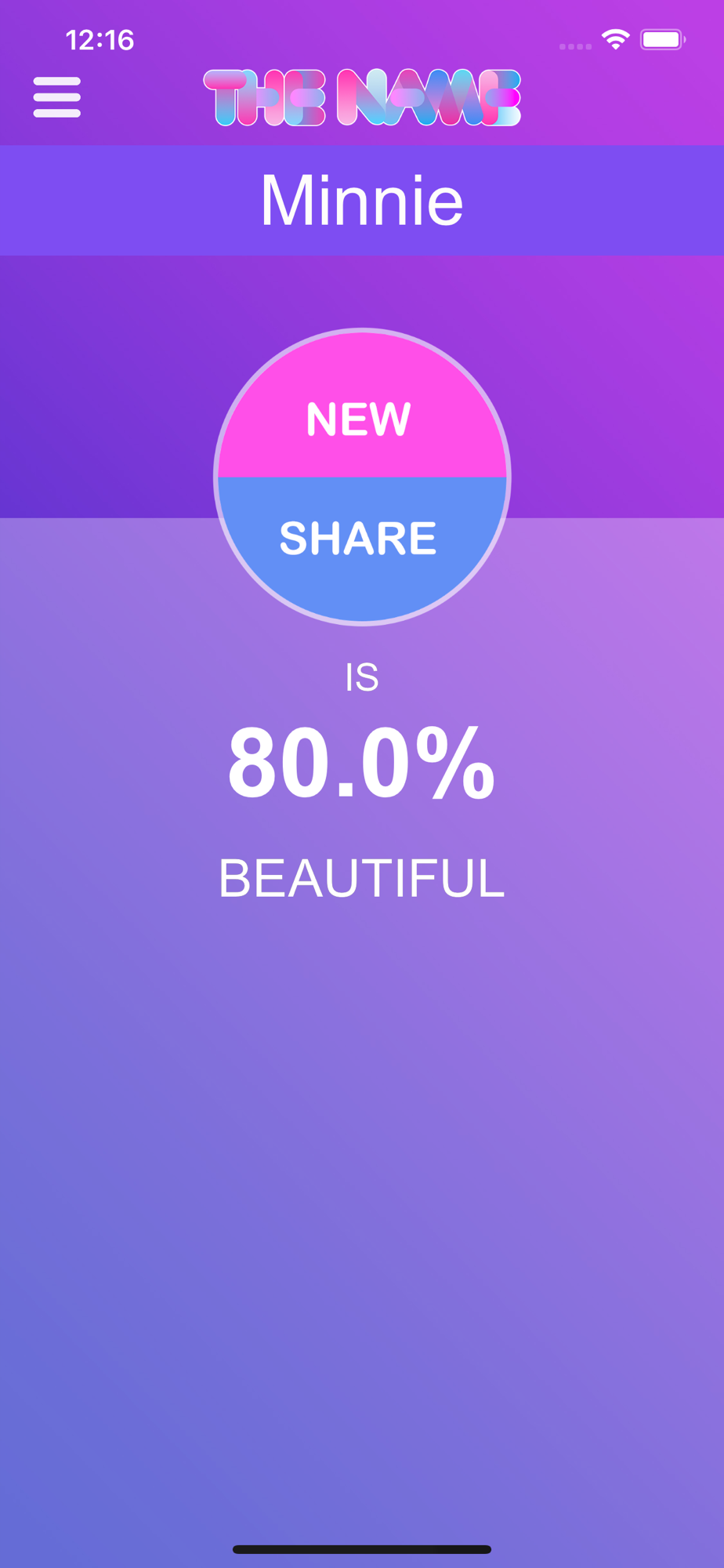 Does your name sound nice to you? Do you and your buddies like it? How beautiful is it compared to their names? Check it out with this app that rates the (sound) beauty of each name on a scale from 0 to 100. Maybe you have the most beautiful name in the world!