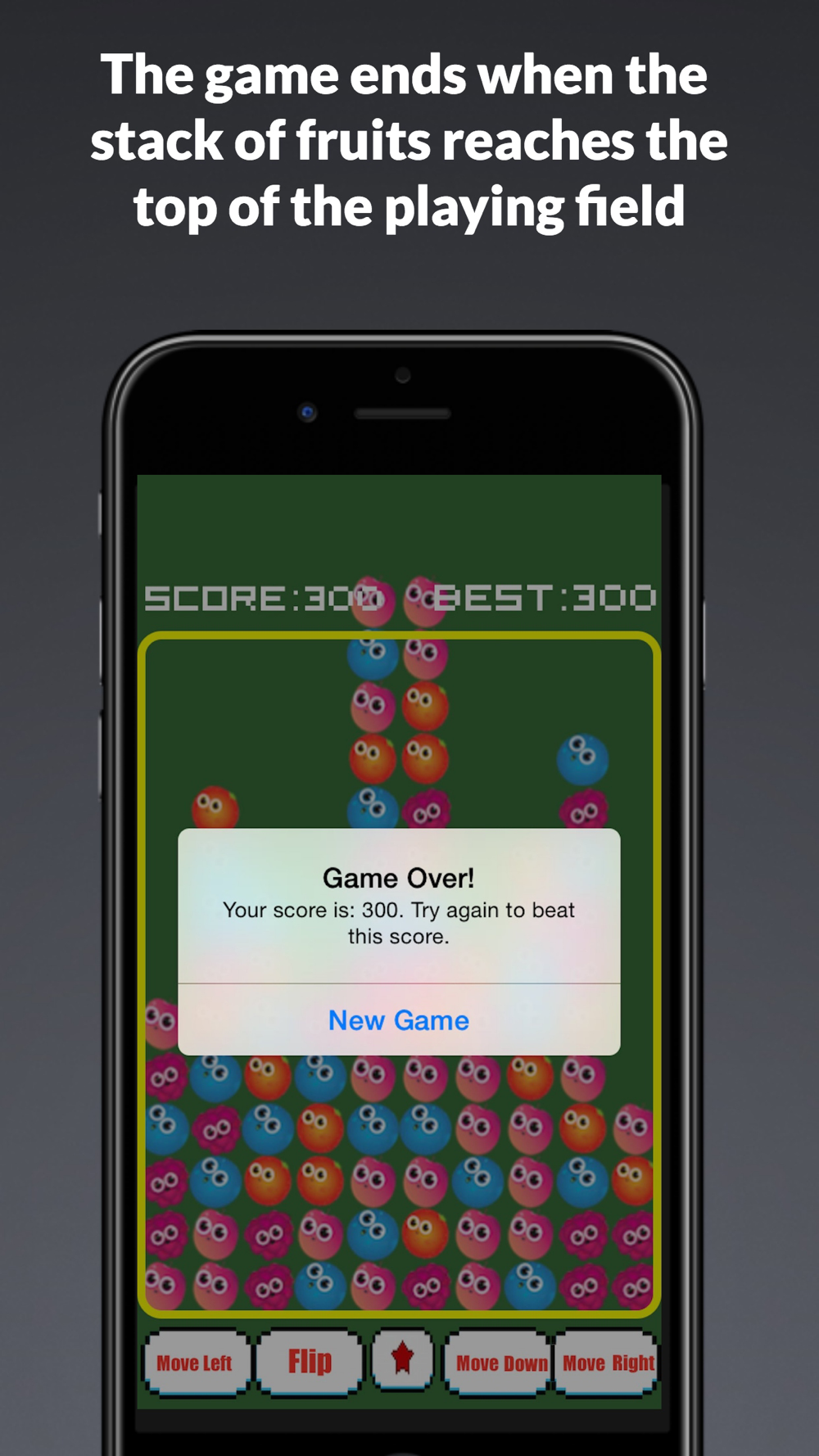 Link/connect four fruits of the same type and color next to each other either vertically or horizontally. You have the option to flip the fruits by 90 degree units and you can also move them down quickly, with the aim off creating a horizontal or vertical line of four similar fruits without gaps. When such a line is created, it disappears, and any block above the deleted line will fall. As the score increases, the fruits fall faster, and the game ends when the stack of fruits reaches the top of the playing field and no new sequence of fruits are able to enter.